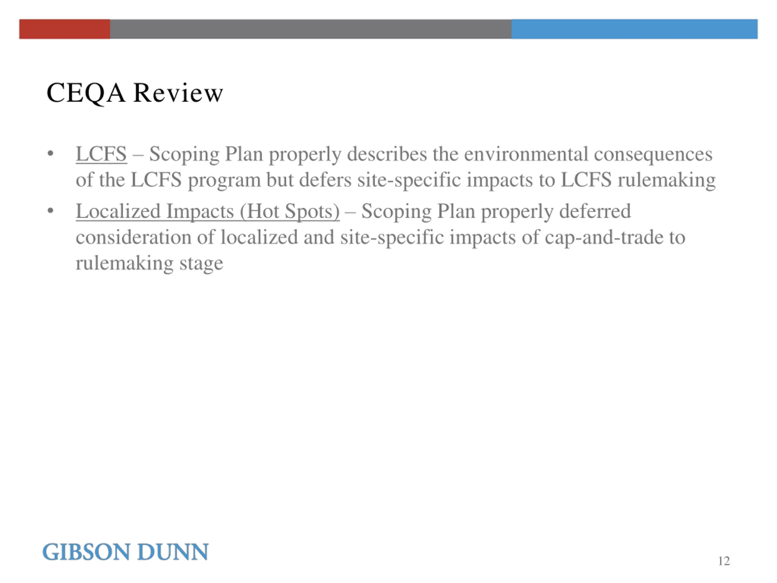 <Presentation Title/Client Name> CEQA Review LCFS Scoping Plan properly describes the environmental consequences of the LCFS program but defers site-specific impacts to LCFS rulemaking Localized Impacts (Hot Spots) Scoping Plan properly deferred consideration of localized and site-specific impacts of cap-and-trade to rulemaking stage 12