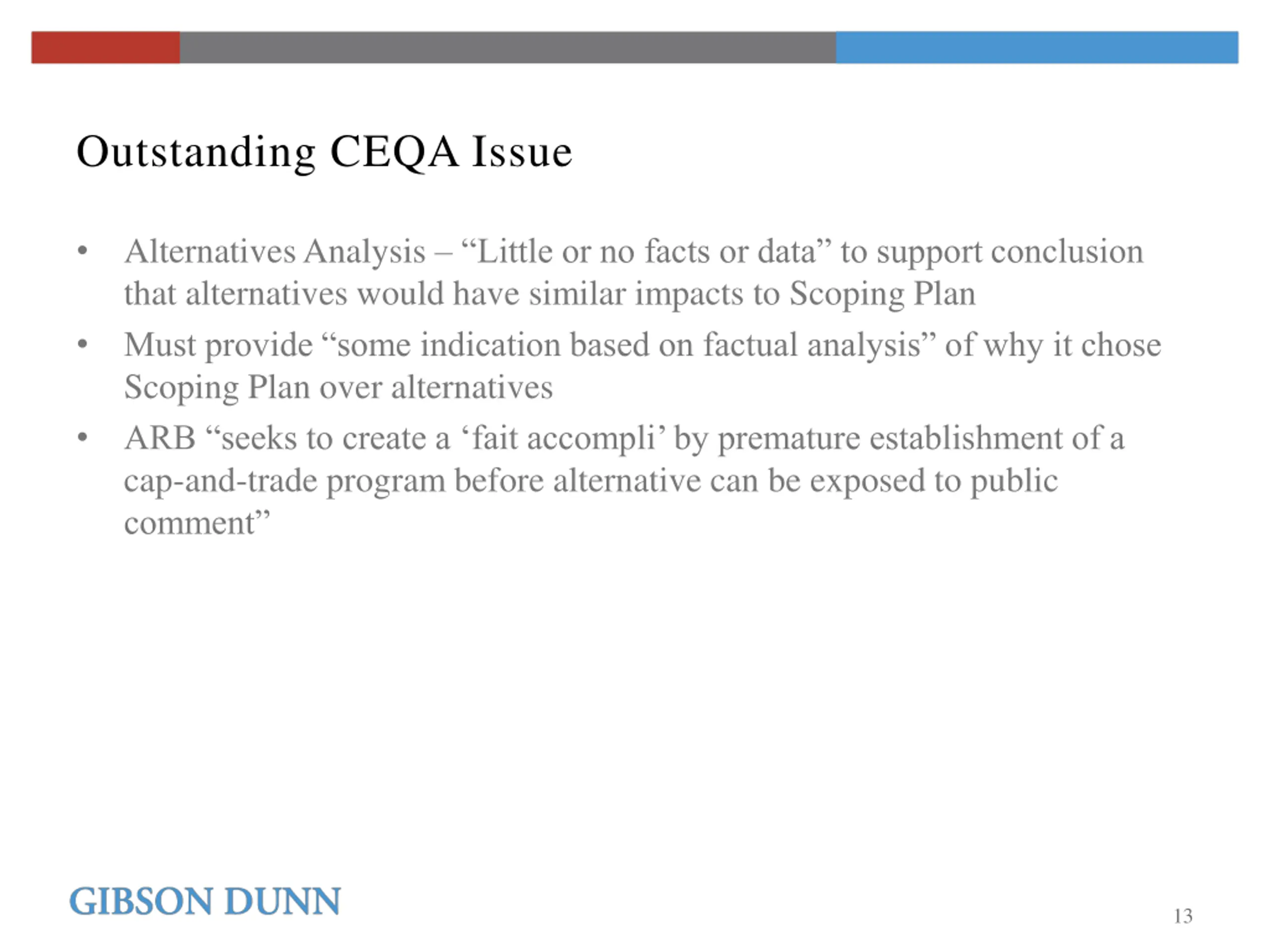 <Presentation Title/Client Name> Outstanding CEQA Issue Alternatives Analysis Little or no facts or data to support conclusion that alternatives would have similar impacts to Scoping Plan Must provide some indication based on factual analysis of why it chose Scoping Plan over alternatives ARB seeks to create a fait accompli by premature establishment of a cap-and-trade program before alternative can be exposed to public comment 13