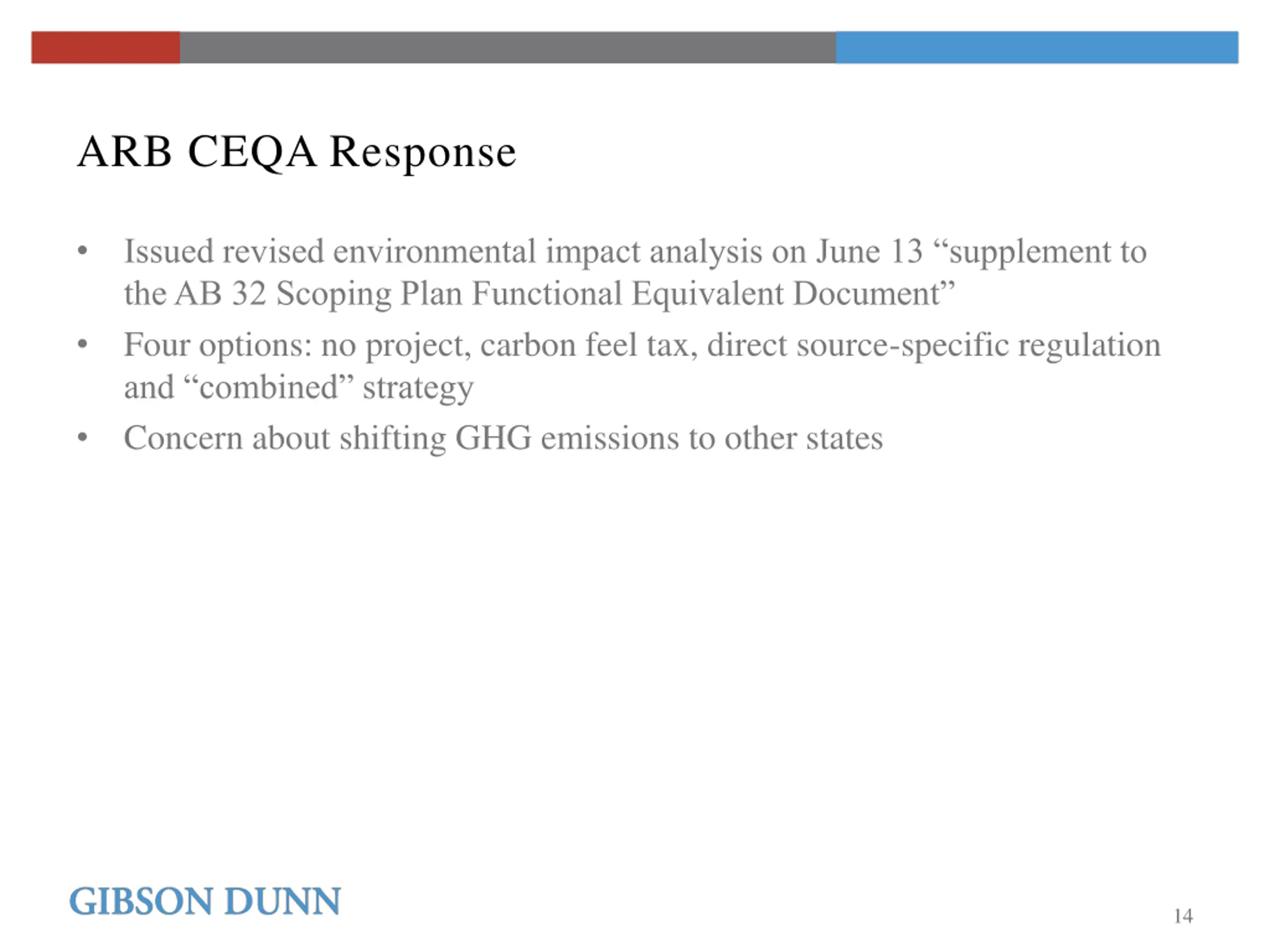 <Presentation Title/Client Name> ARB CEQA Response Issued revised environmental impact analysis on June 13 supplement to the AB 32 Scoping Plan Functional Equivalent Document Four options: no project, carbon feel tax, direct source-specific regulation and combined strategy Concern about shifting GHG emissions to other states 14