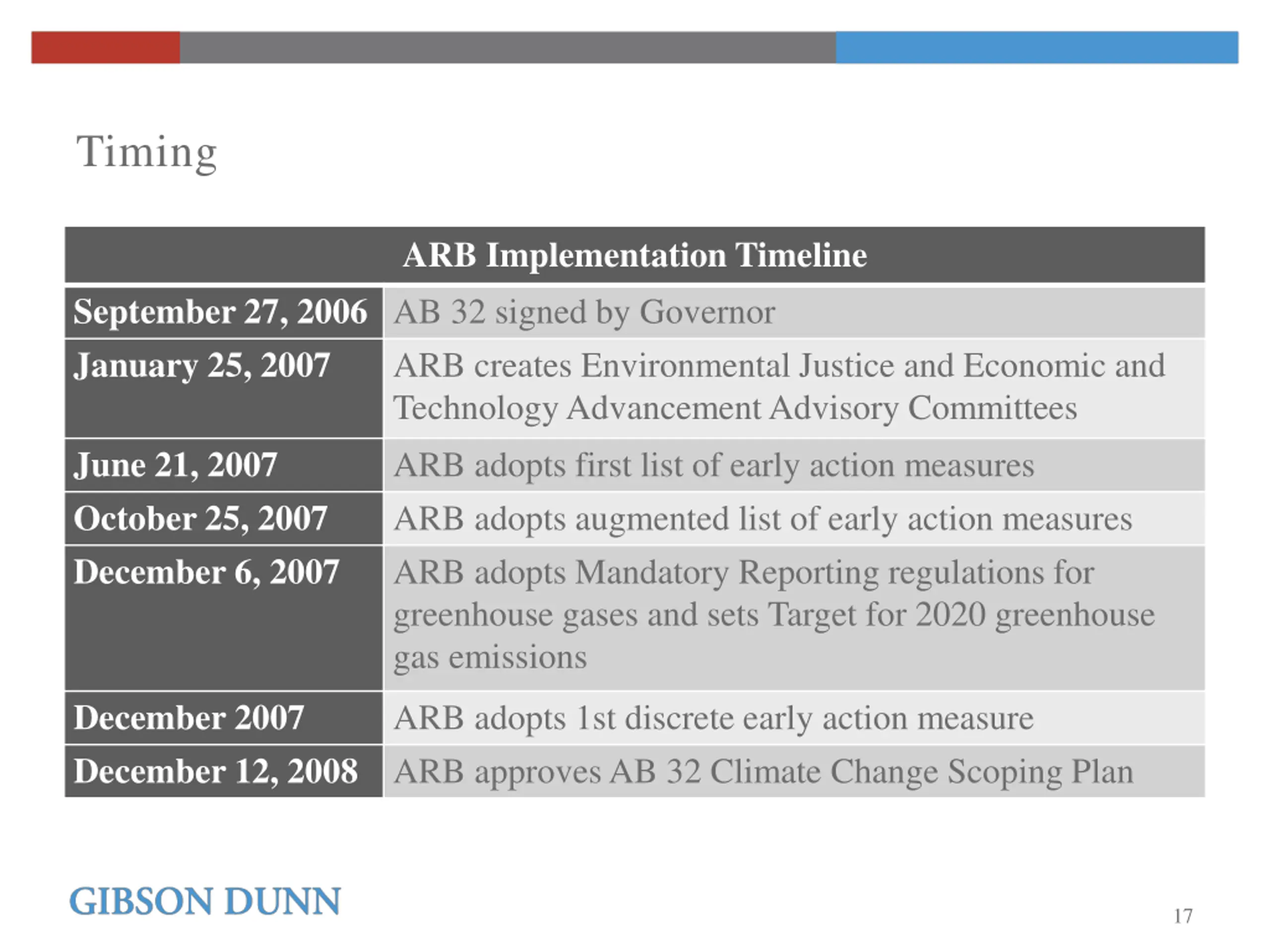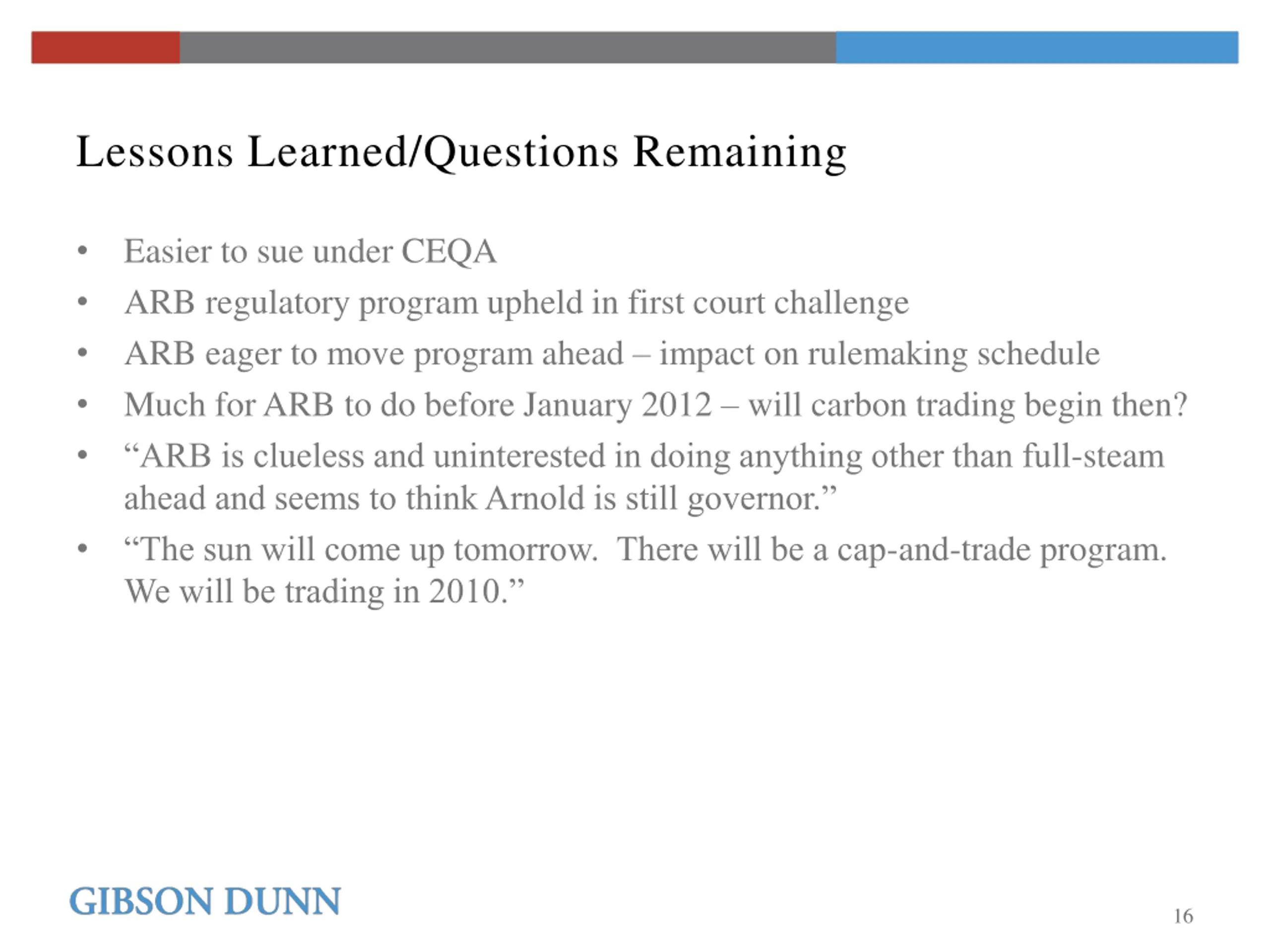 <Presentation Title/Client Name> Lessons Learned/Questions Remaining Easier to sue under CEQA ARB regulatory program upheld in first court challenge ARB eager to move program ahead impact on rulemaking schedule Much for ARB to do before January 2012 will carbon trading begin then? ARB is clueless and uninterested in doing anything other than full-steam ahead and seems to think Arnold is still governor. The sun will come up tomorrow. There will be a cap-and-trade program. We will be trading in 2010. 16