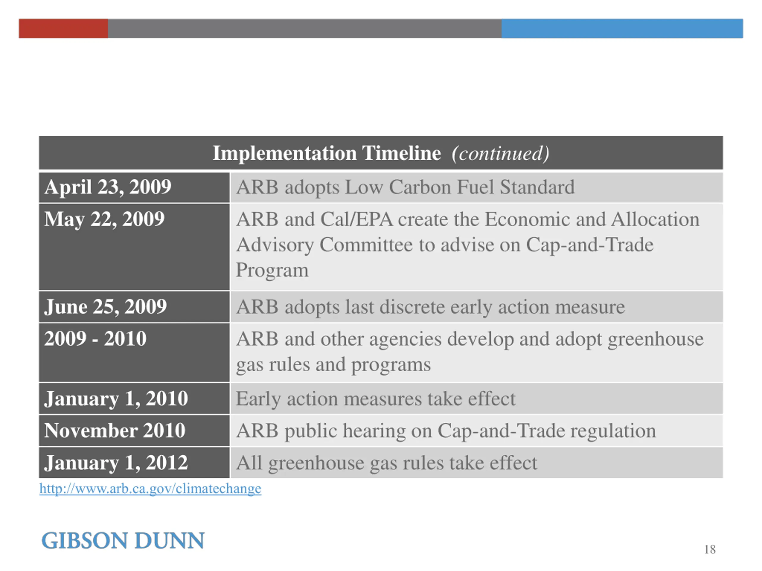 <Presentation Title/Client Name> Timing ARB Implementation Timeline September 27, 2006 AB 32 signed by Governor January 25, 2007 ARB creates Environmental Justice and Economic and Technology Advancement Advisory Committees June 21, 2007 ARB adopts first list of early action measures October 25, 2007 ARB adopts augmented list of early action measures December 6, 2007 ARB adopts Mandatory Reporting regulations for greenhouse gases and sets Target for 2020 greenhouse gas emissions December 2007 December 12, 2008 ARB adopts 1st discrete early action measure ARB approves AB 32 Climate Change Scoping Plan 17