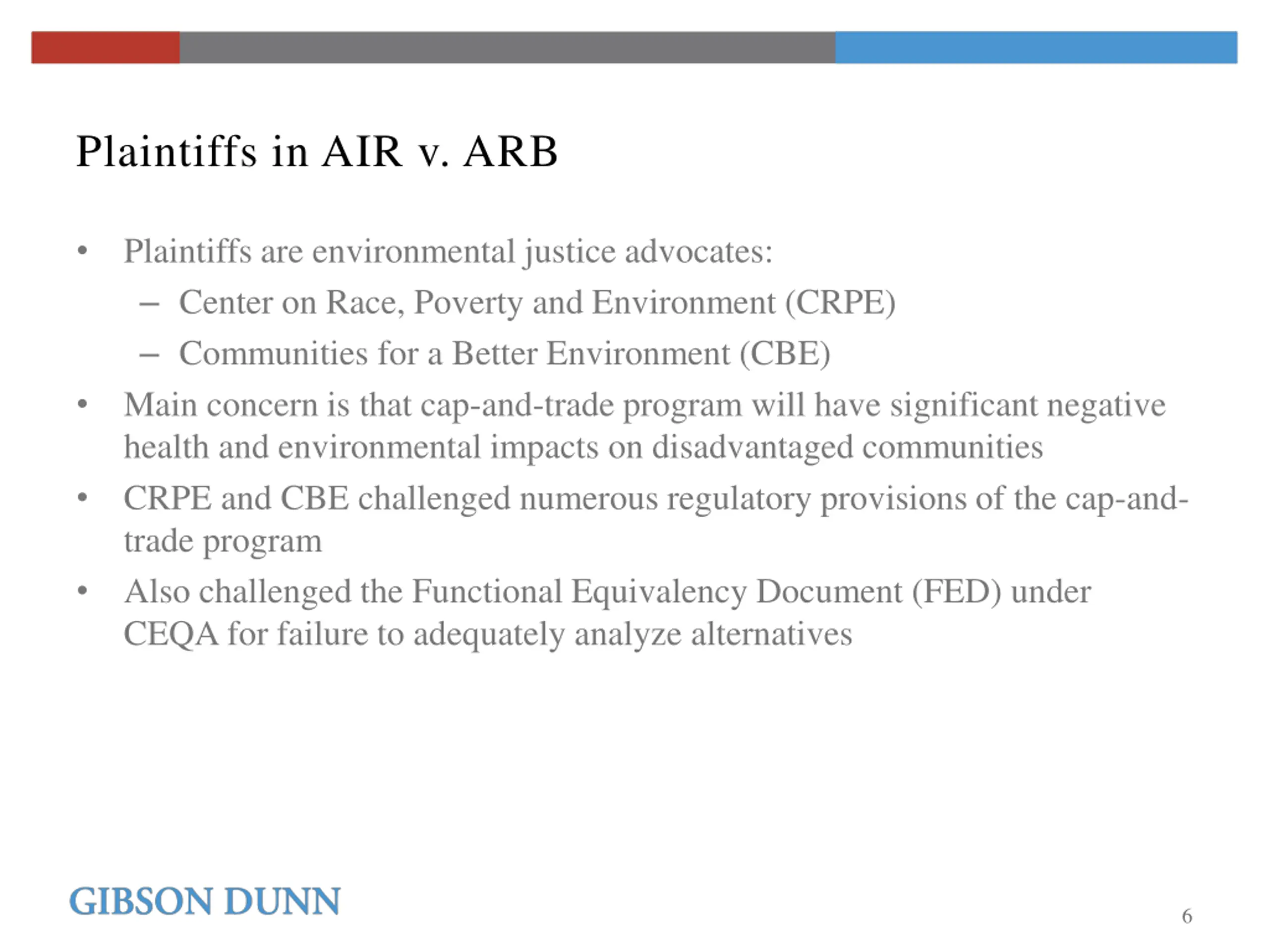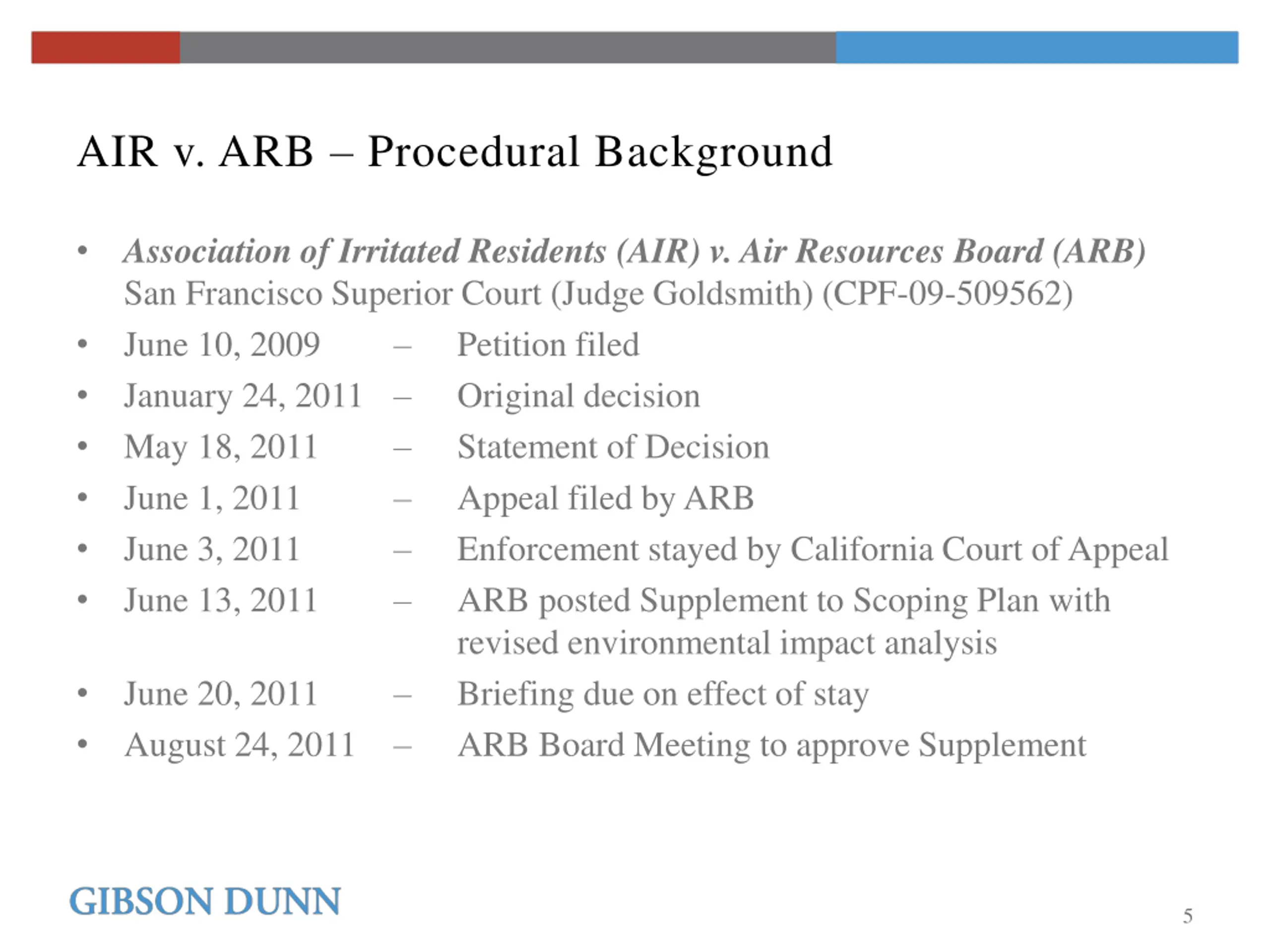 <Presentation Title/Client Name> AIR v. ARB Procedural Background Association of Irritated Residents (AIR) v. Air Resources Board (ARB) San Francisco Superior Court (Judge Goldsmith) (CPF-09-509562) June 10, 2009 Petition filed January 24, 2011 Original decision May 18, 2011 Statement of Decision June 1, 2011 Appeal filed by ARB June 3, 2011 Enforcement stayed by California Court of Appeal June 13, 2011 ARB posted Supplement to Scoping Plan with revised environmental impact analysis June 20, 2011 Briefing due on effect of stay August 24, 2011 ARB Board Meeting to approve Supplement 5