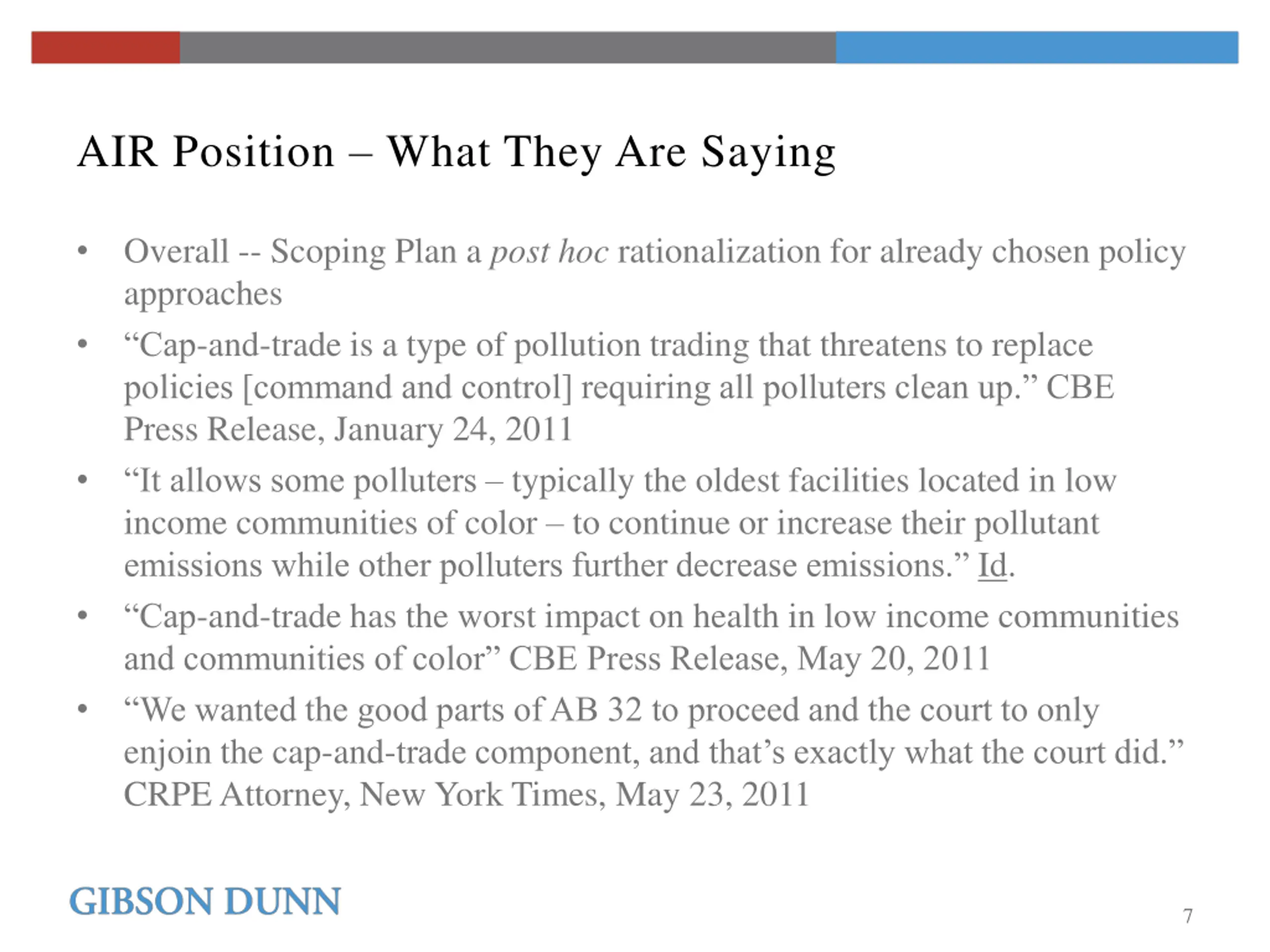 <Presentation Title/Client Name> AIR Position What They Are Saying Overall -- Scoping Plan a post hoc rationalization for already chosen policy approaches Cap-and-trade is a type of pollution trading that threatens to replace policies [command and control] requiring all polluters clean up. CBE Press Release, January 24, 2011 It allows some polluters typically the oldest facilities located in low income communities of color to continue or increase their pollutant emissions while other polluters further decrease emissions. Id. Cap-and-trade has the worst impact on health in low income communities and communities of color CBE Press Release, May 20, 2011 We wanted the good parts of AB 32 to proceed and the court to only enjoin the cap-and-trade component, and that s exactly what the court did. CRPE Attorney, New York Times, May 23, 2011 7