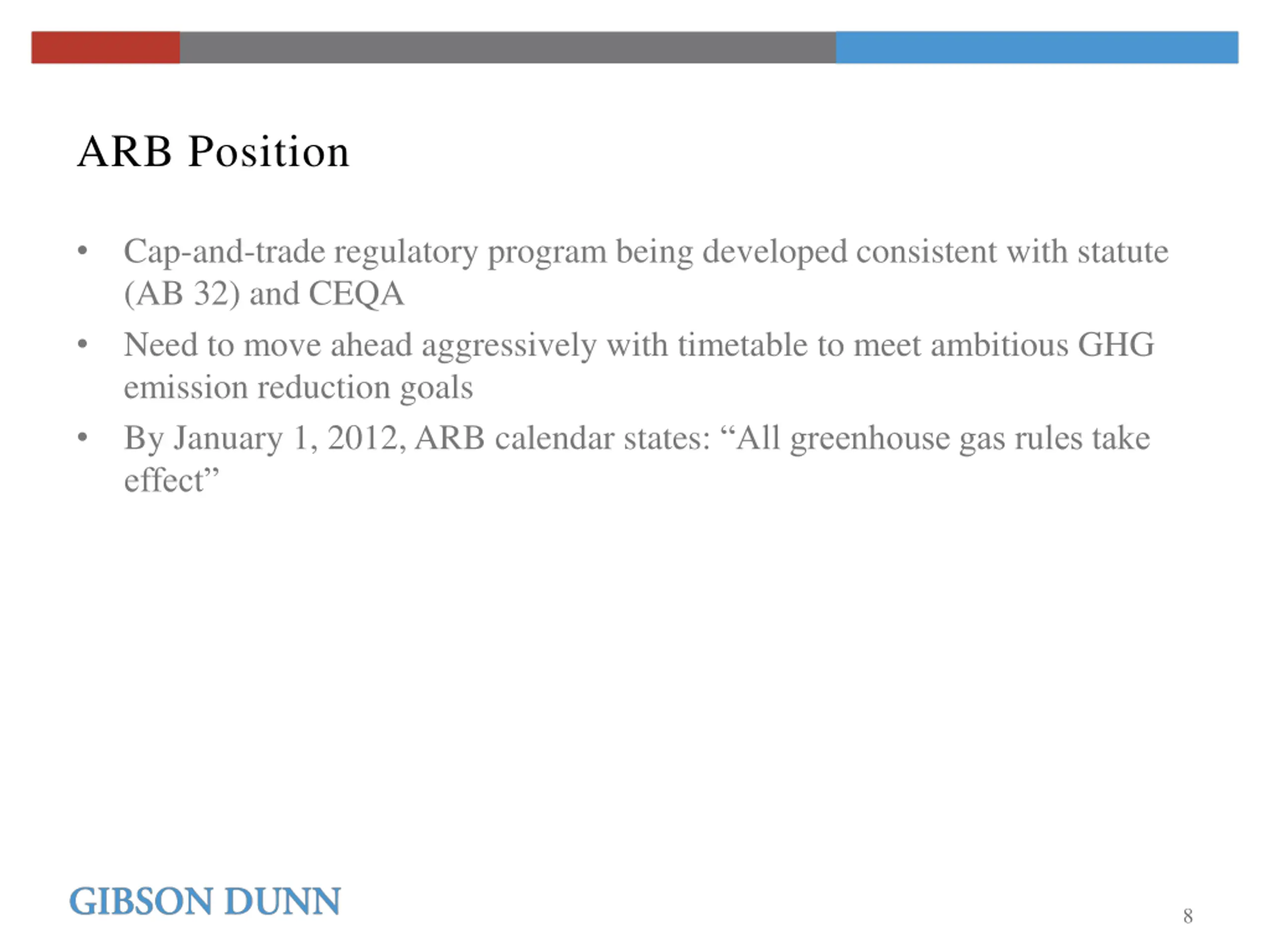 <Presentation Title/Client Name> ARB Position Cap-and-trade regulatory program being developed consistent with statute (AB 32) and CEQA Need to move ahead aggressively with timetable to meet ambitious GHG emission reduction goals By January 1, 2012, ARB calendar states: All greenhouse gas rules take effect 8