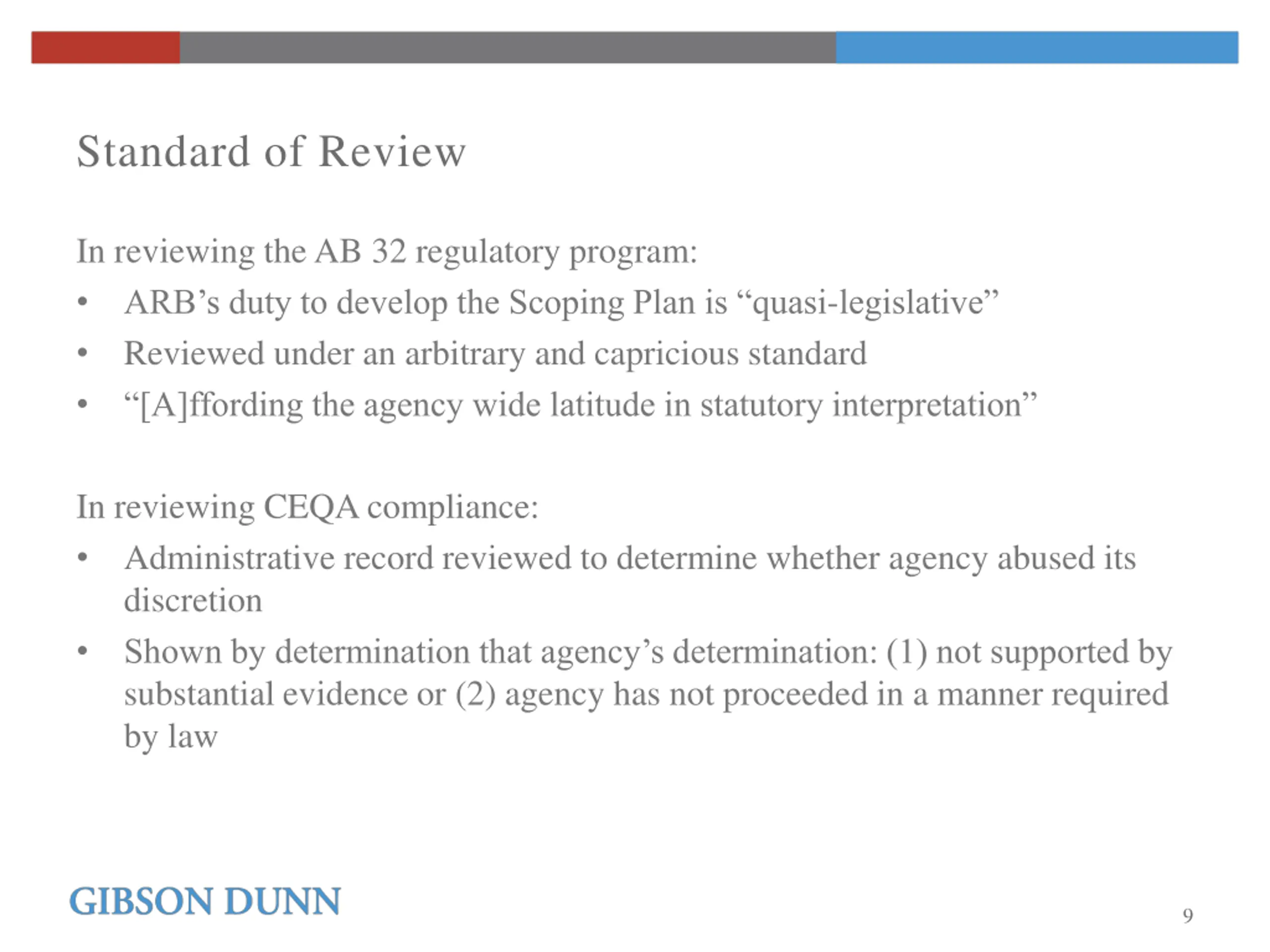 <Presentation Title/Client Name> Standard of Review In reviewing the AB 32 regulatory program: ARB s duty to develop the Scoping Plan is quasi-legislative Reviewed under an arbitrary and capricious standard [A]ffording the agency wide latitude in statutory interpretation In reviewing CEQA compliance: Administrative record reviewed to determine whether agency abused its discretion Shown by determination that agency s determination: (1) not supported by substantial evidence or (2) agency has not proceeded in a manner required by law 9