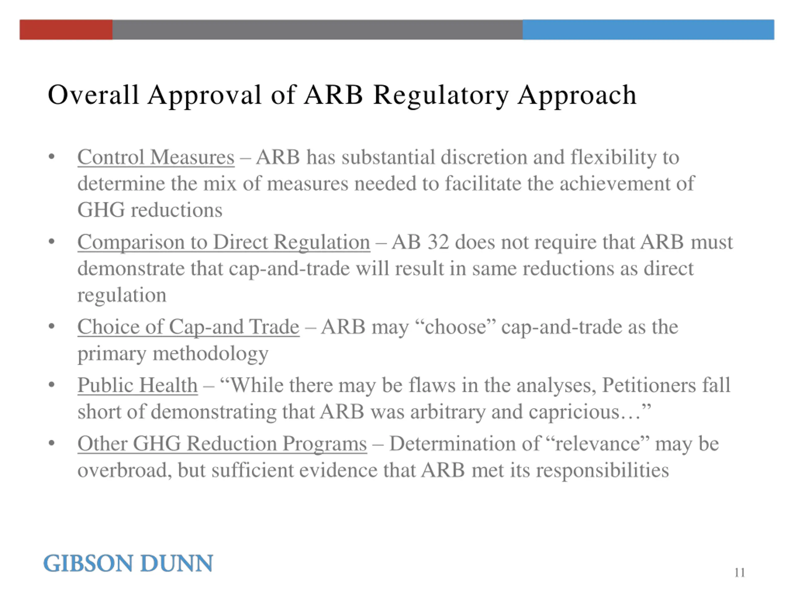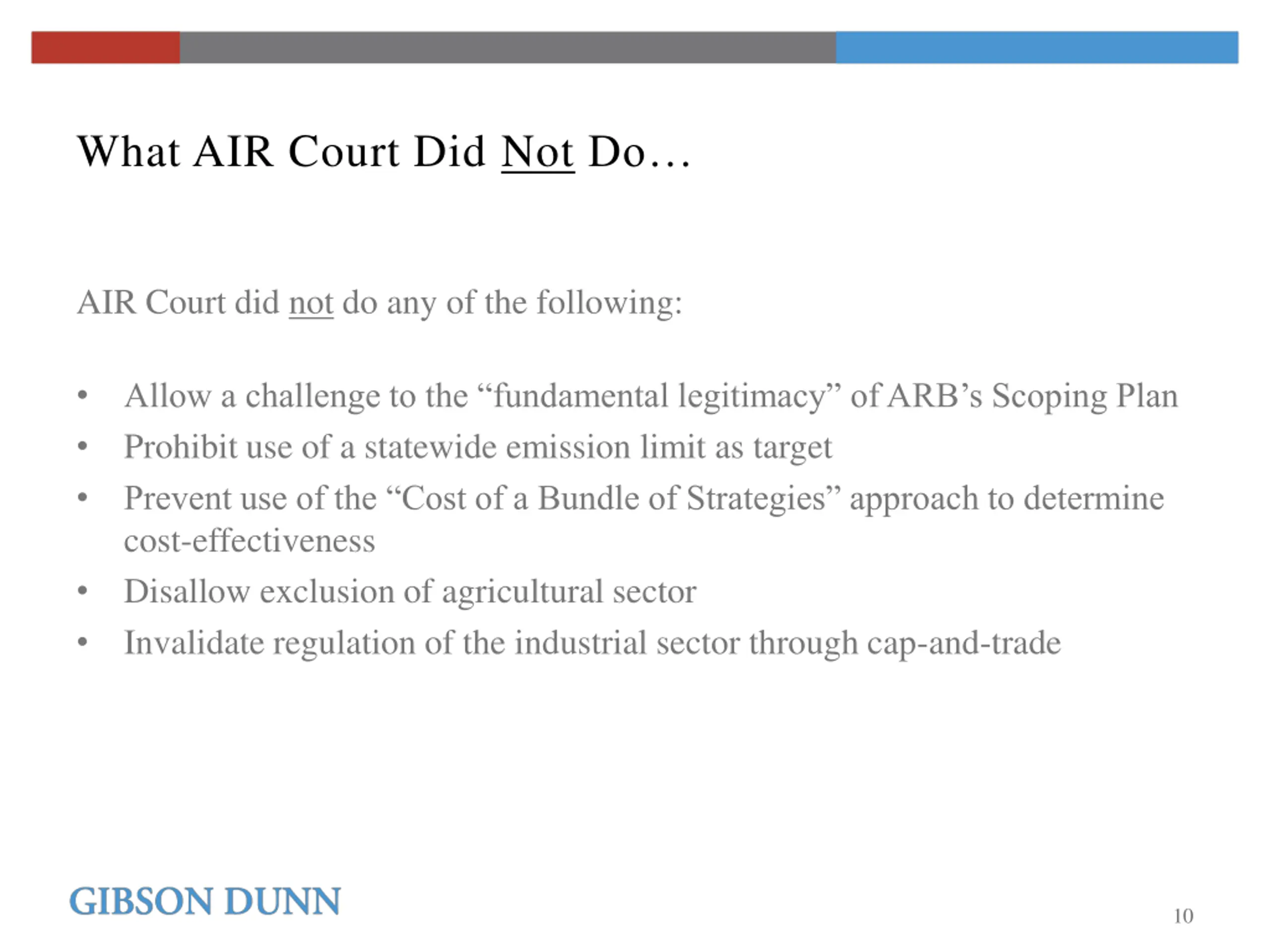 <Presentation Title/Client Name> What AIR Court Did Not Do AIR Court did not do any of the following: Allow a challenge to the fundamental legitimacy of ARB s Scoping Plan Prohibit use of a statewide emission limit as target Prevent use of the Cost of a Bundle of Strategies approach to determine cost-effectiveness Disallow exclusion of agricultural sector Invalidate regulation of the industrial sector through cap-and-trade 10