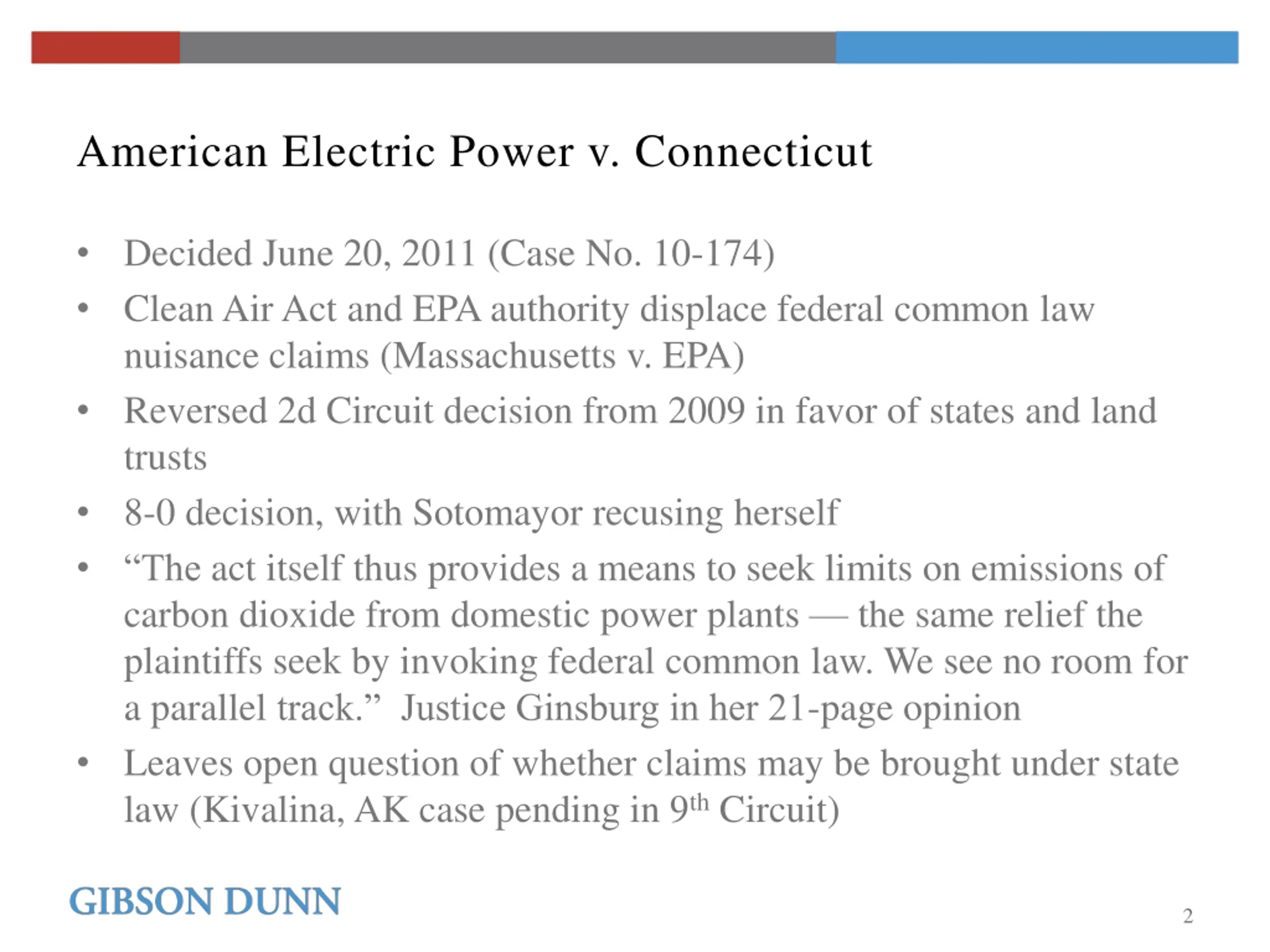<Presentation Title/Client Name> American Electric Power v. Connecticut Decided June 20, 2011 (Case No. 10-174) Clean Air Act and EPA authority displace federal common law nuisance claims (Massachusetts v. EPA) Reversed 2d Circuit decision from 2009 in favor of states and land trusts 8-0 decision, with Sotomayor recusing herself The act itself thus provides a means to seek limits on emissions of carbon dioxide from domestic power plants the same relief the plaintiffs seek by invoking federal common law. We see no room for a parallel track. Justice Ginsburg in her 21-page opinion Leaves open question of whether claims may be brought under state law (Kivalina, AK case pending in 9th Circuit) 2