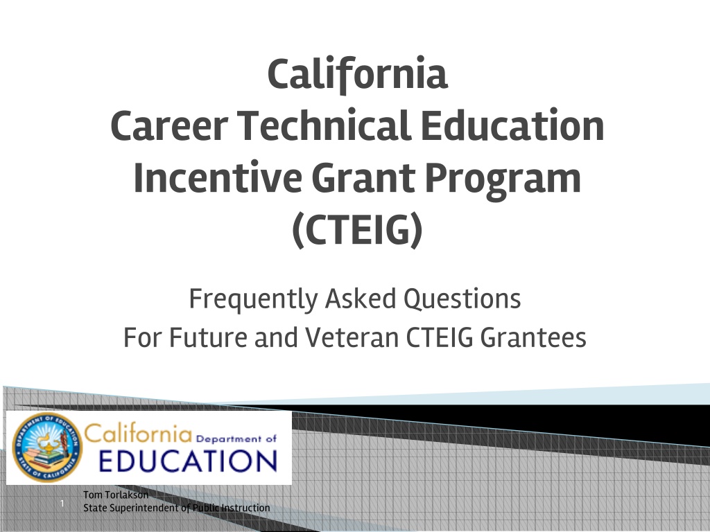 California Career Technical Education Incentive Grant Program (CTEIG) Frequently Asked Questions For Future and Veteran CTEIG Grantees Tom Torlakson State Superintendent of Public Instruction 1