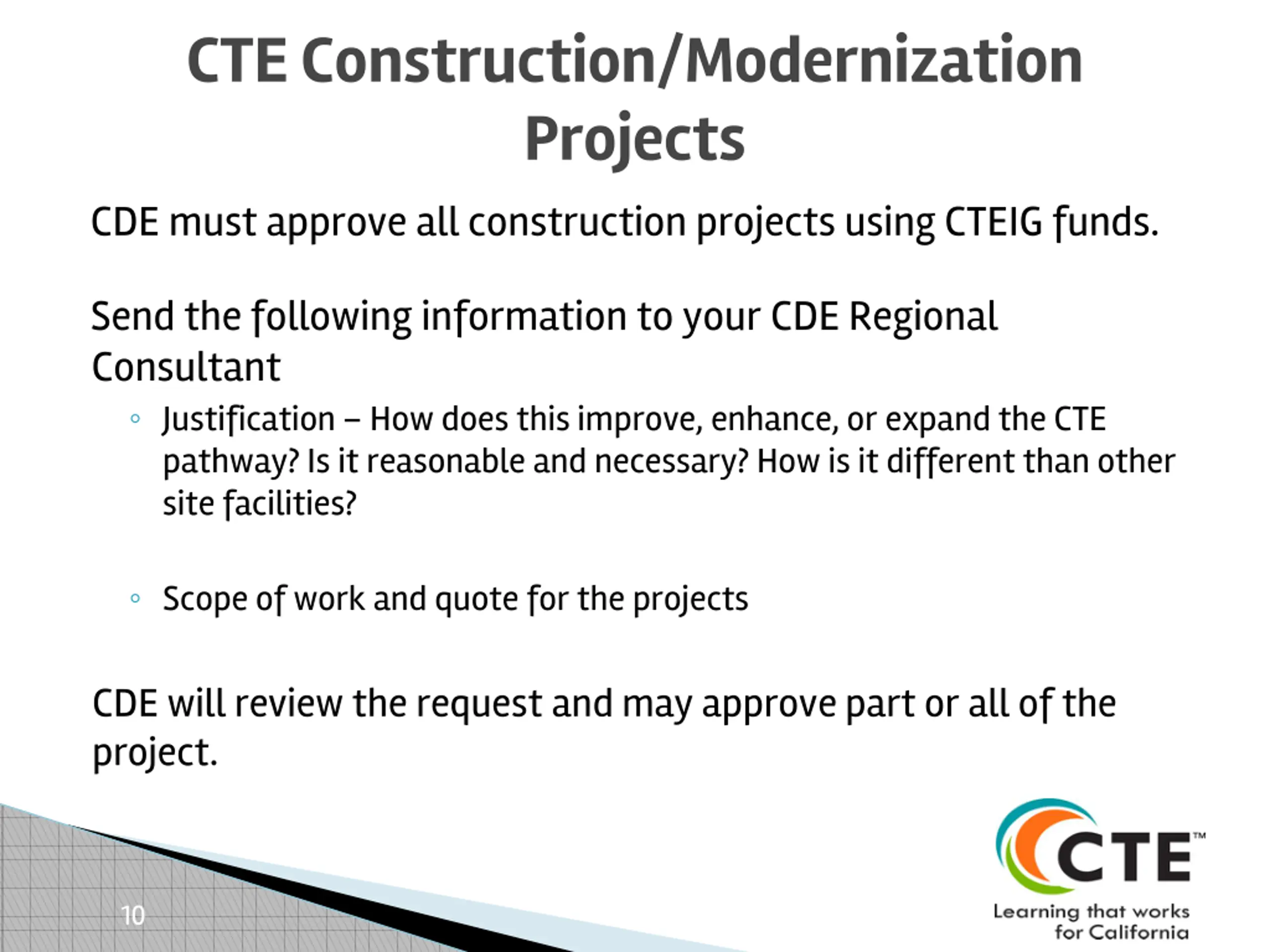 CTE Construction/Modernization Projects CDE must approve all construction projects using CTEIG funds. Send the following information to your CDE Regional Consultant Justification How does this improve, enhance, or expand the CTE pathway? Is it reasonable and necessary? How is it different than other site facilities? Scope of work and quote for the projects CDE will review the request and may approve part or all of the project. 10