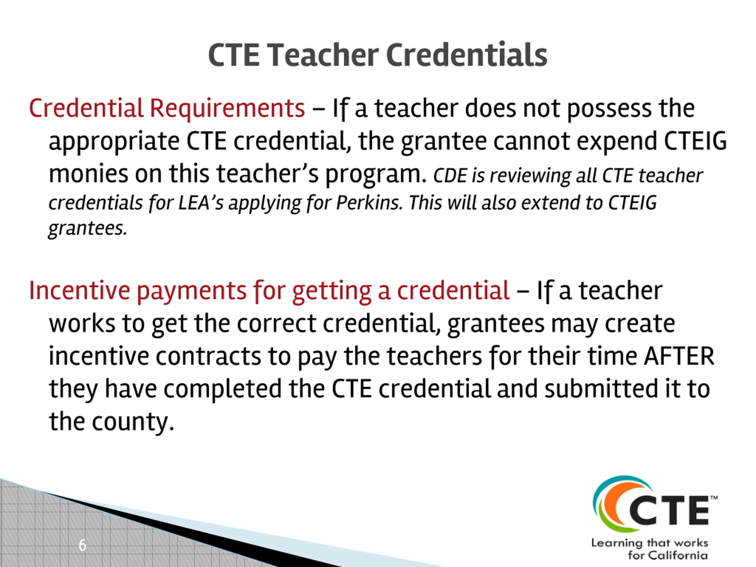 CTE Teacher Credentials Credential Requirements If a teacher does not possess the appropriate CTE credential, the grantee cannot expend CTEIG monies on this teacher s program. CDE is reviewing all CTE teacher credentials for LEA s applying for Perkins. This will also extend to CTEIG grantees. Incentive payments for getting a credential If a teacher works to get the correct credential, grantees may create incentive contracts to pay the teachers for their time AFTER they have completed the CTE credential and submitted it to the county. 6