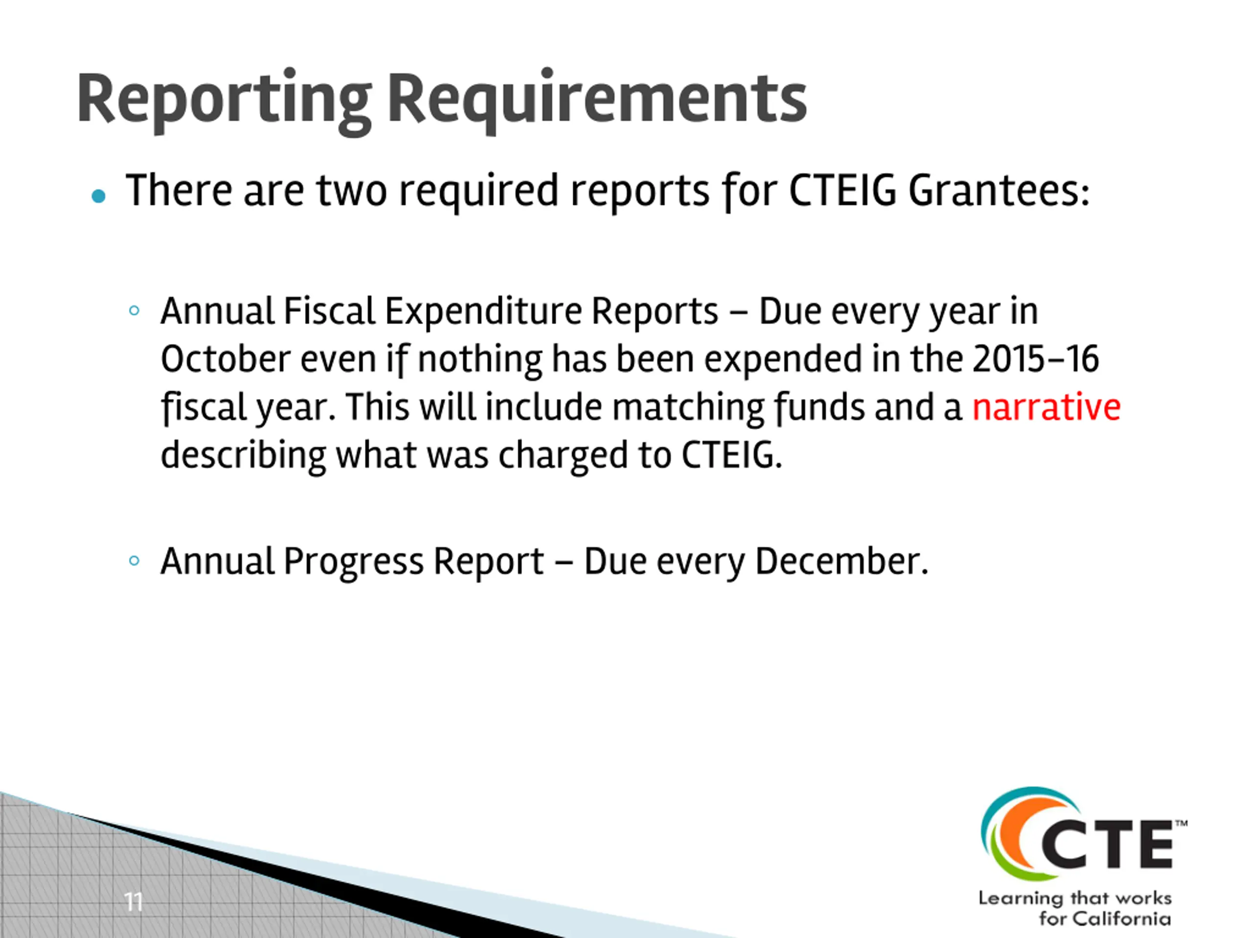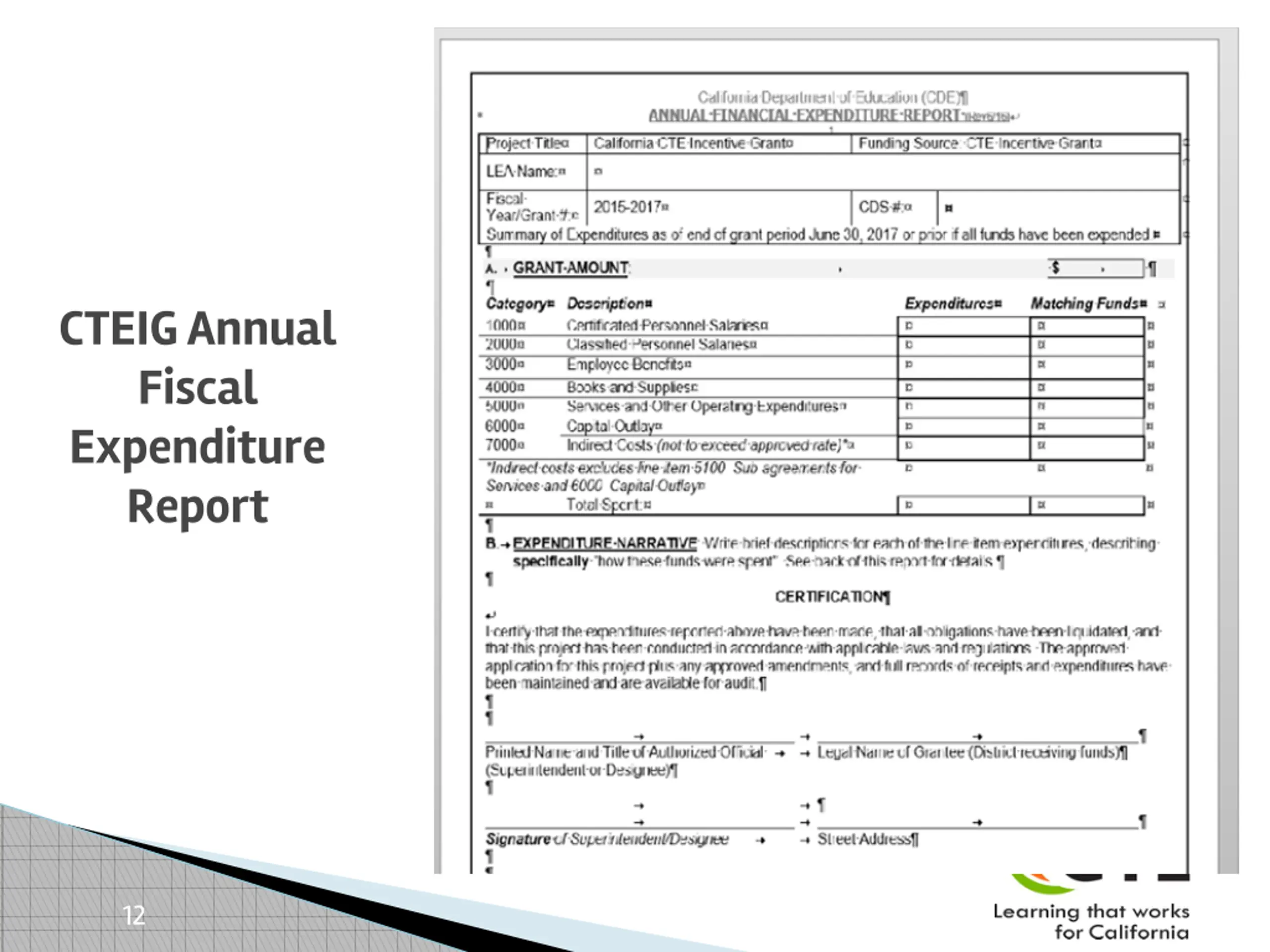 Reporting Requirements There are two required reports for CTEIG Grantees: Annual Fiscal Expenditure Reports Due every year in October even if nothing has been expended in the 2015-16 fiscal year. This will include matching funds and a narrative describing what was charged to CTEIG. Annual Progress Report Due every December. 11