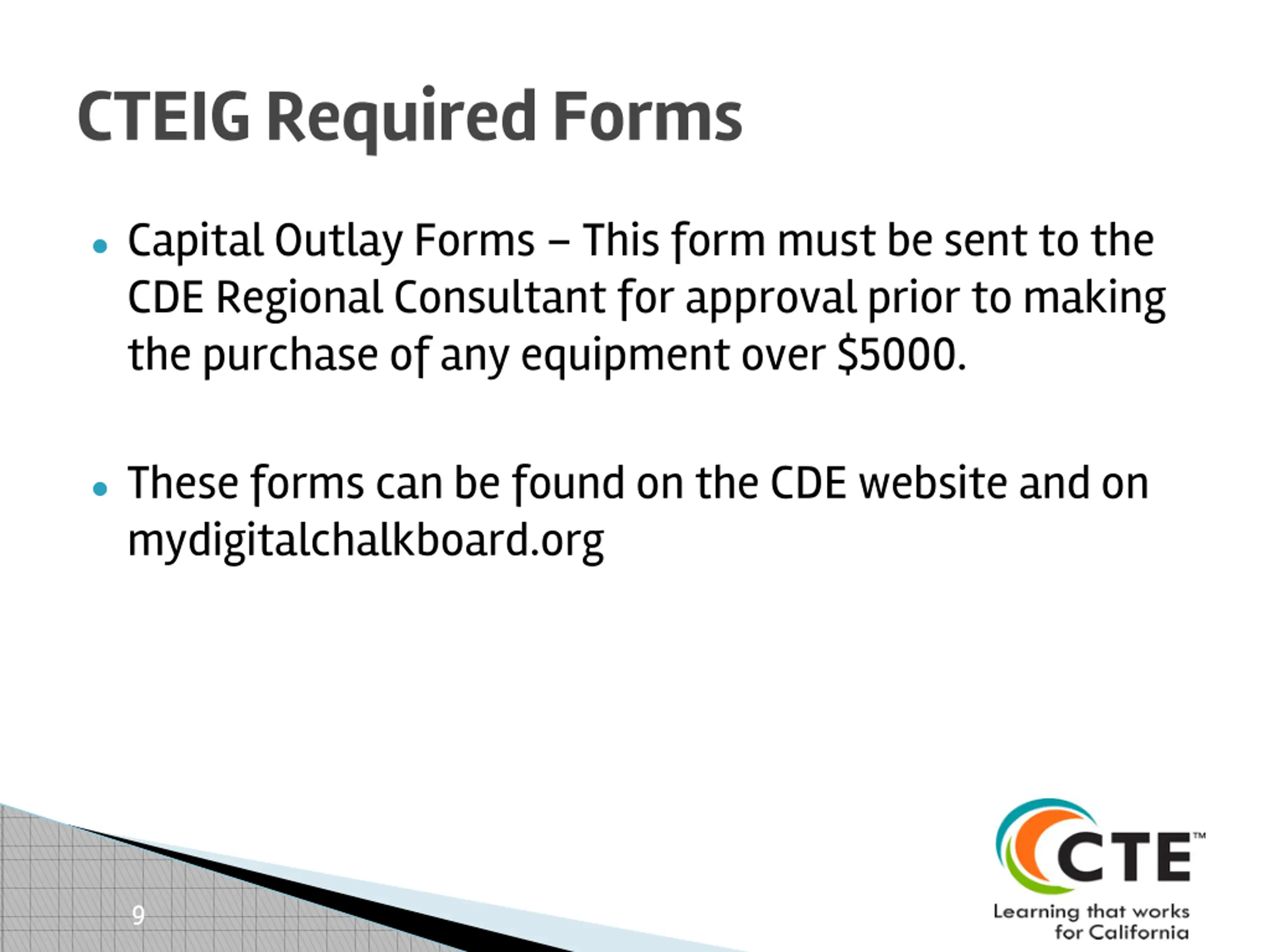 CTEIG Required Forms Capital Outlay Forms This form must be sent to the CDE Regional Consultant for approval prior to making the purchase of any equipment over $5000. These forms can be found on the CDE website and on mydigitalchalkboard.org 9