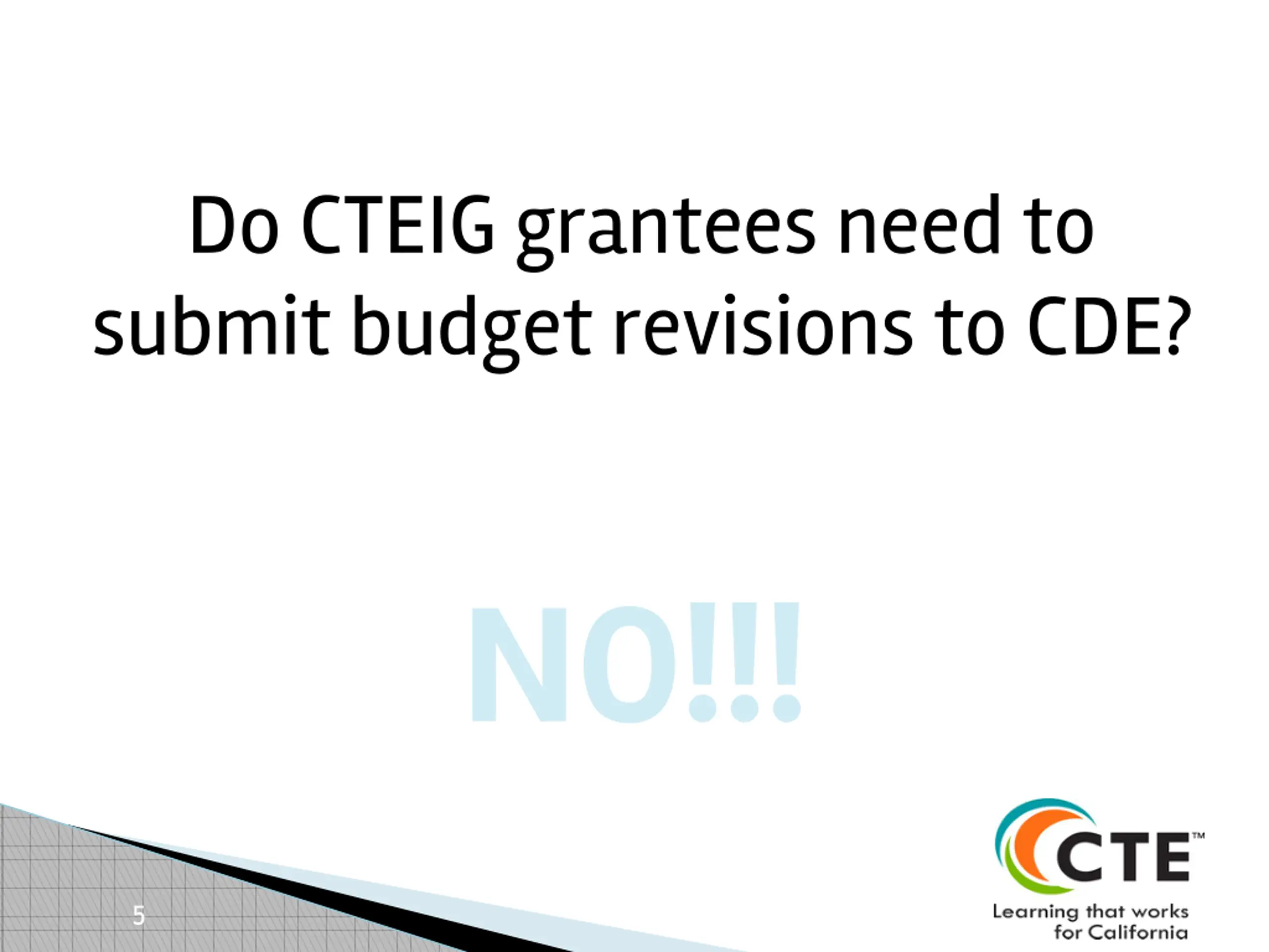 Do CTEIG grantees need to submit budget revisions to CDE? NO!!! 5