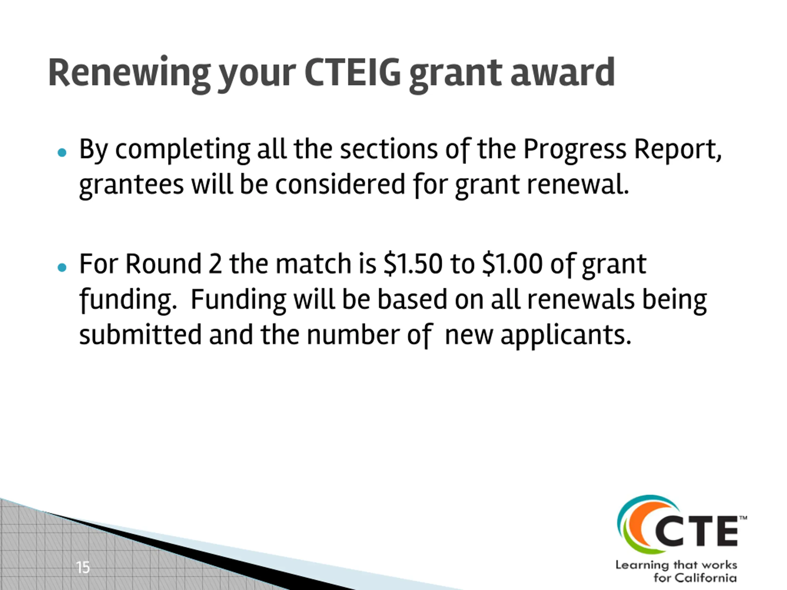 Renewing your CTEIG grant award By completing all the sections of the Progress Report, grantees will be considered for grant renewal. For Round 2 the match is $1.50 to $1.00 of grant funding. Funding will be based on all renewals being submitted and the number of new applicants. 15