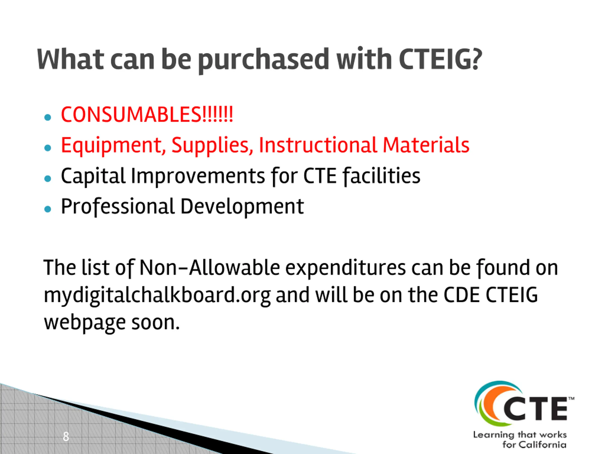 What can be purchased with CTEIG? CONSUMABLES!!!!!! Equipment, Supplies, Instructional Materials Capital Improvements for CTE facilities Professional Development The list of Non-Allowable expenditures can be found on mydigitalchalkboard.org and will be on the CDE CTEIG webpage soon. 8