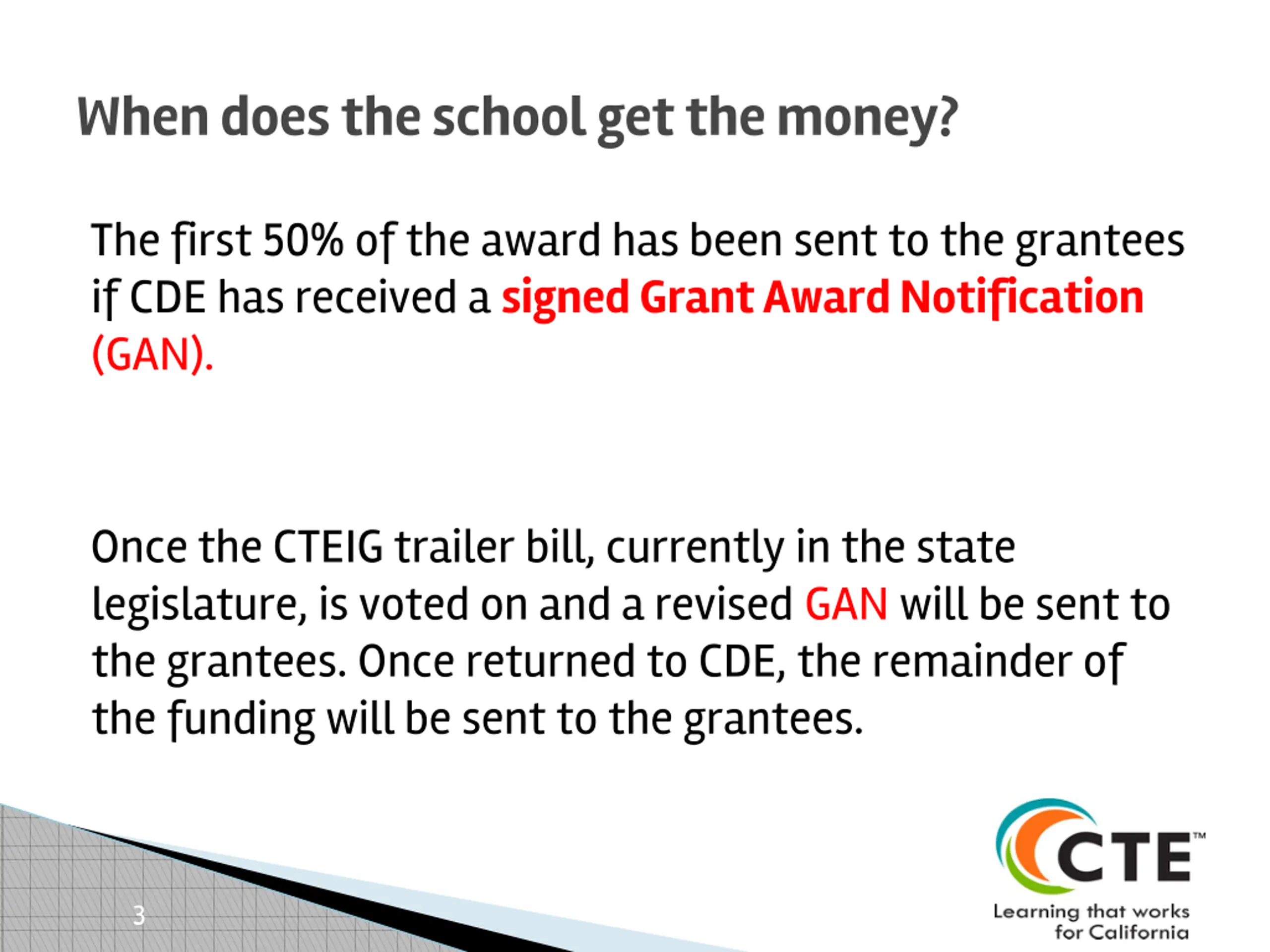When does the school get the money? The first 50% of the award has been sent to the grantees if CDE has received a signed Grant Award Notification (GAN). Once the CTEIG trailer bill, currently in the state legislature, is voted on and a revised GAN will be sent to the grantees. Once returned to CDE, the remainder of the funding will be sent to the grantees. 3