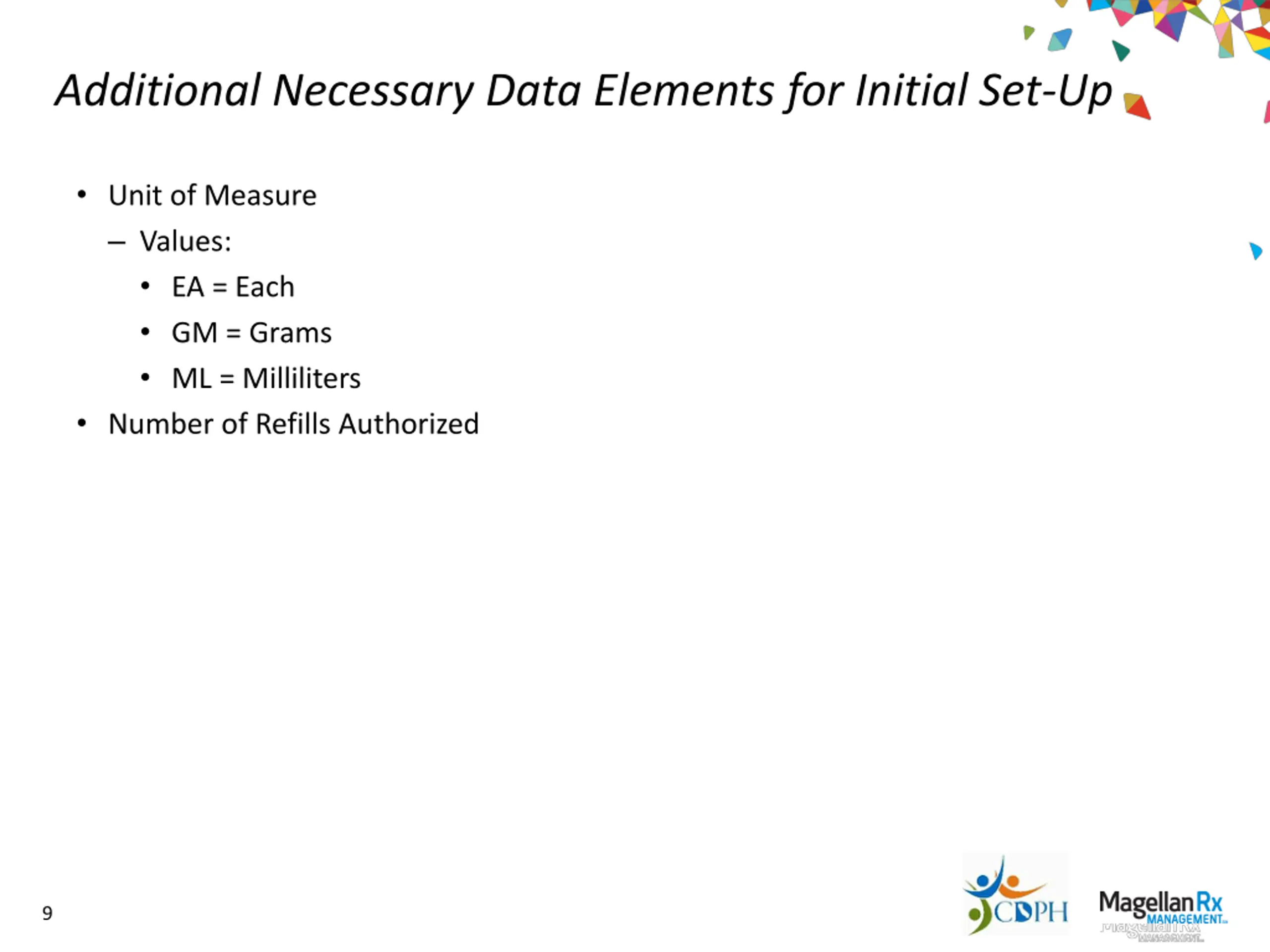 Additional Necessary Data Elements for Initial Set-Up Unit of Measure Values: EA = Each GM = Grams ML = Milliliters Number of Refills Authorized 9