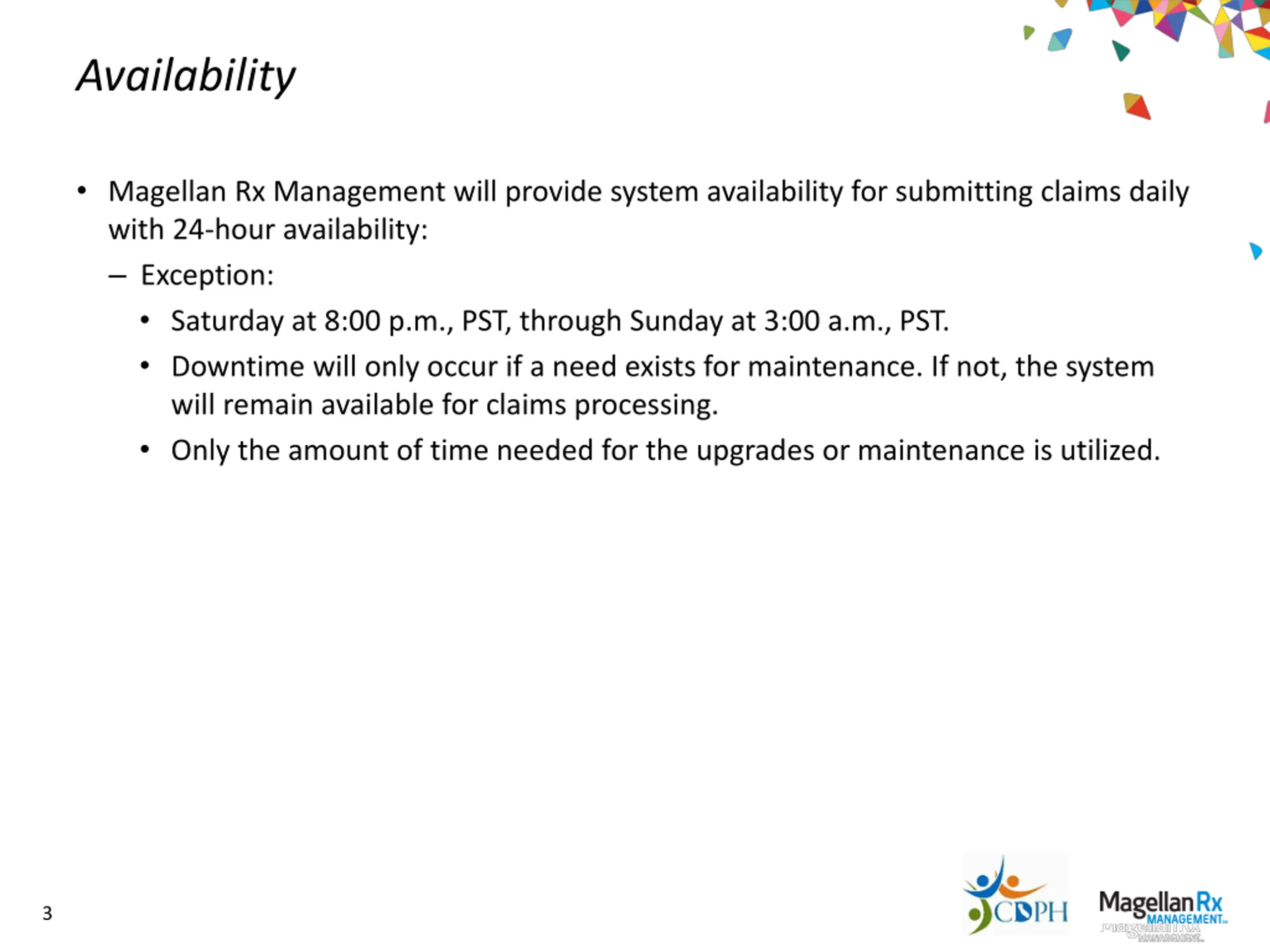 Availability Magellan Rx Management will provide system availability for submitting claims daily with 24-hour availability: Exception: Saturday at 8:00 p.m., PST, through Sunday at 3:00 a.m., PST. Downtime will only occur if a need exists for maintenance. If not, the system will remain available for claims processing. Only the amount of time needed for the upgrades or maintenance is utilized. 3