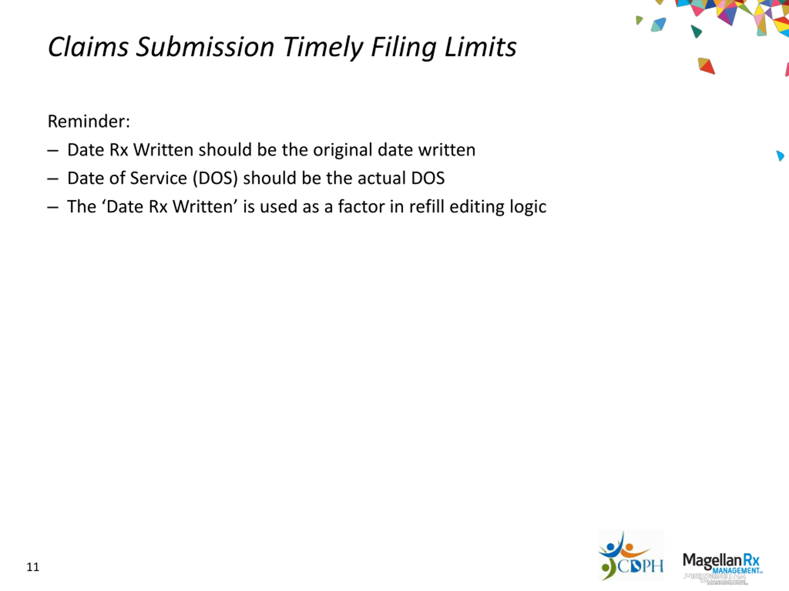 Claims Submission Timely Filing Limits Reminder: Date Rx Written should be the original date written Date of Service (DOS) should be the actual DOS The Date Rx Written is used as a factor in refill editing logic 11