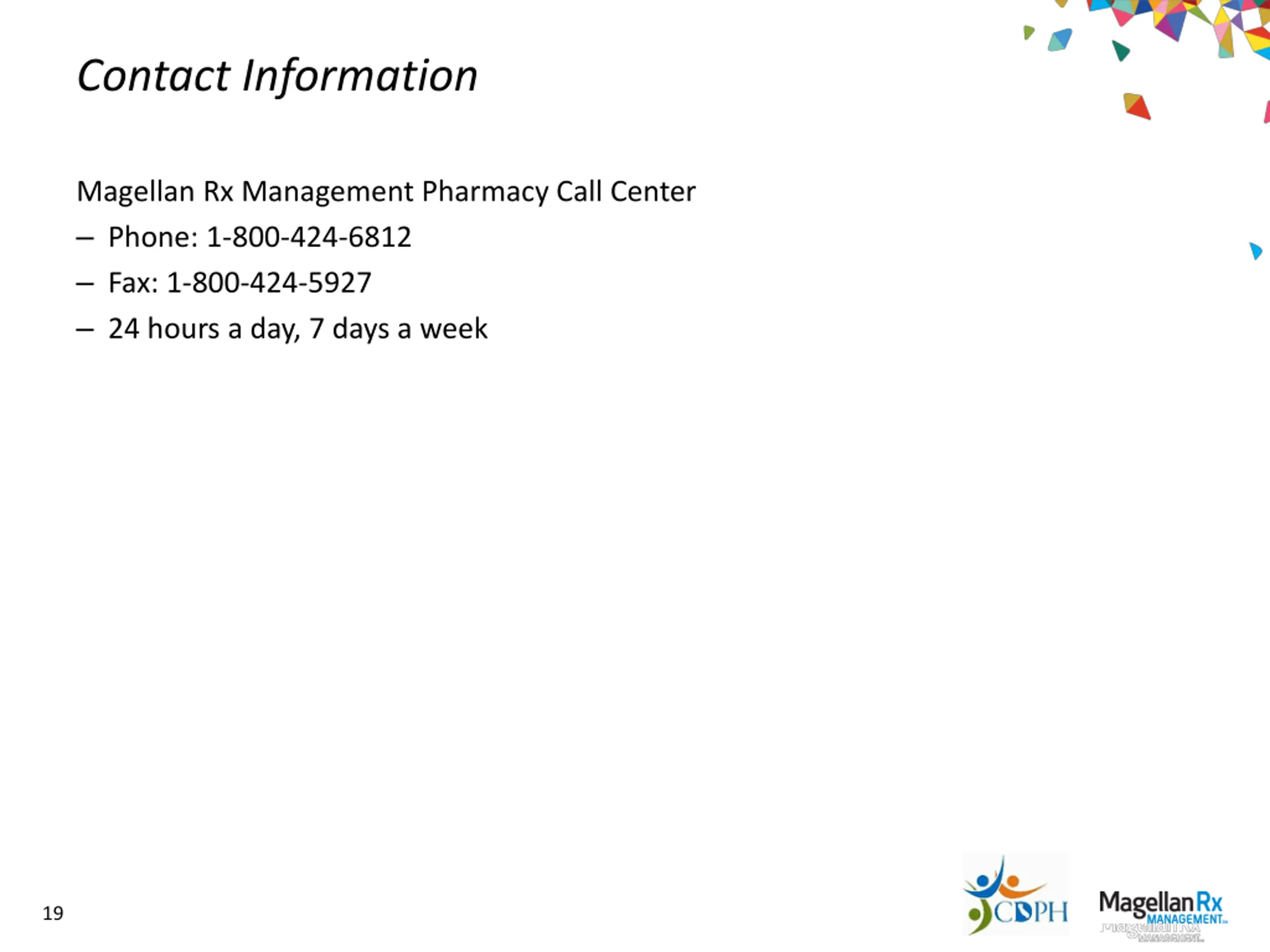 Contact Information Magellan Rx Management Pharmacy Call Center Phone: 1-800-424-6812 Fax: 1-800-424-5927 24 hours a day, 7 days a week 19