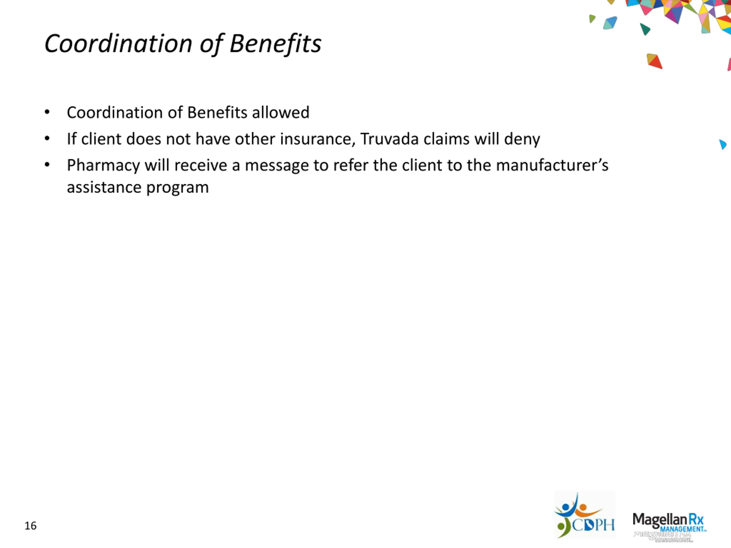 Coordination of Benefits Coordination of Benefits allowed If client does not have other insurance, Truvada claims will deny Pharmacy will receive a message to refer the client to the manufacturer s assistance program 16