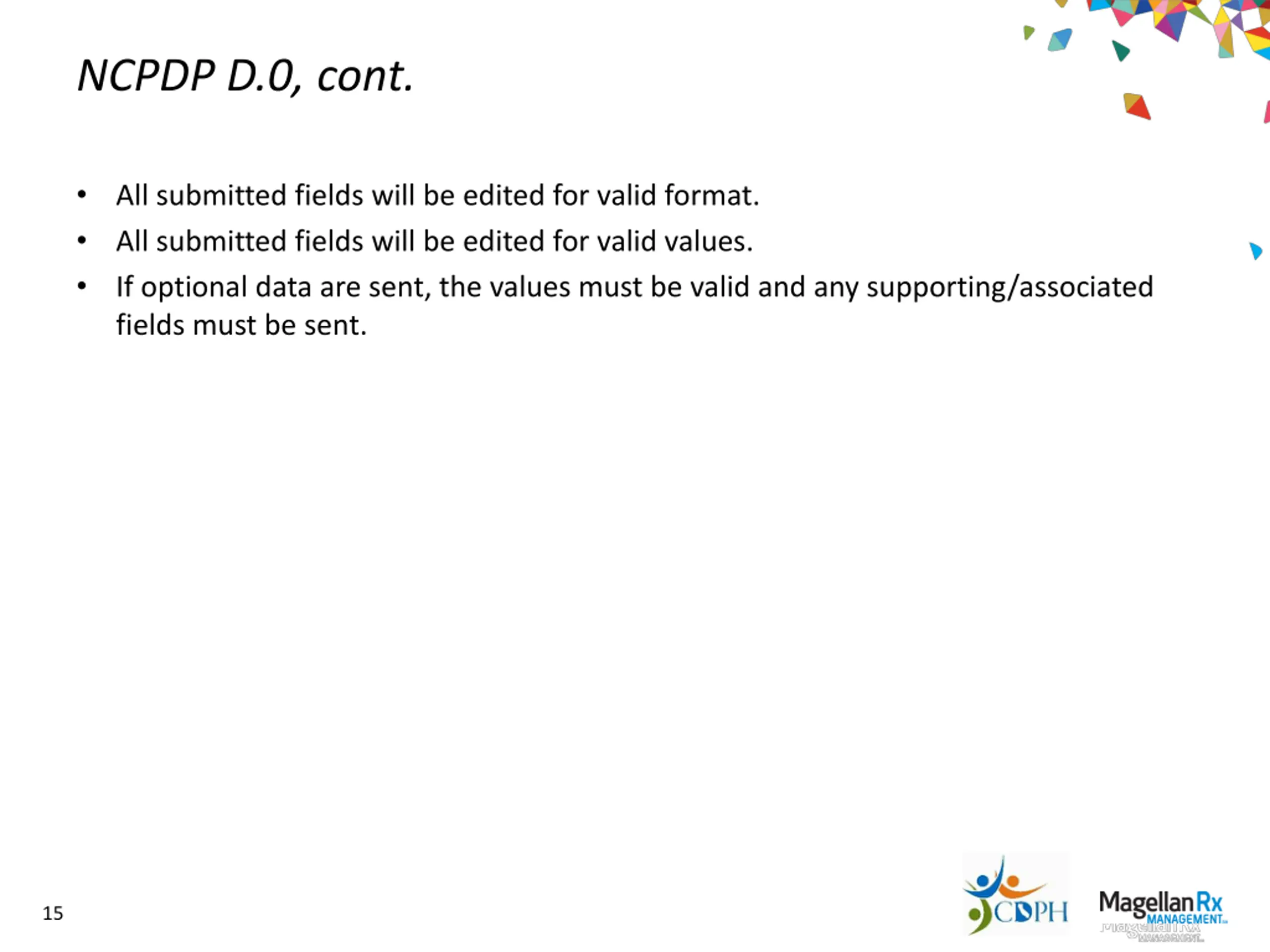 NCPDP D.0, cont. All submitted fields will be edited for valid format. All submitted fields will be edited for valid values. If optional data are sent, the values must be valid and any supporting/associated fields must be sent. 15