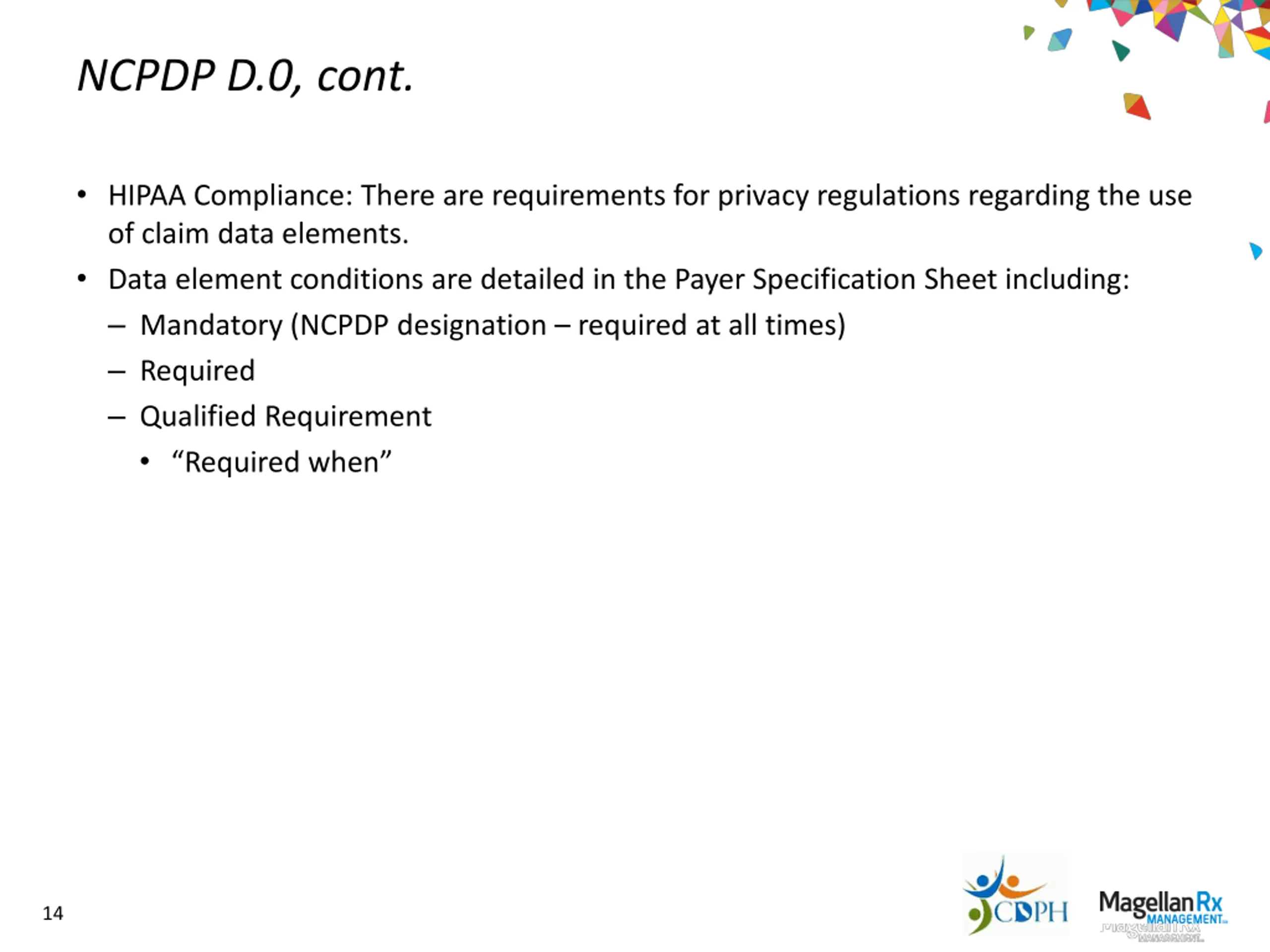 NCPDP D.0, cont. HIPAA Compliance: There are requirements for privacy regulations regarding the use of claim data elements. Data element conditions are detailed in the Payer Specification Sheet including: Mandatory (NCPDP designation required at all times) Required Qualified Requirement Required when 14