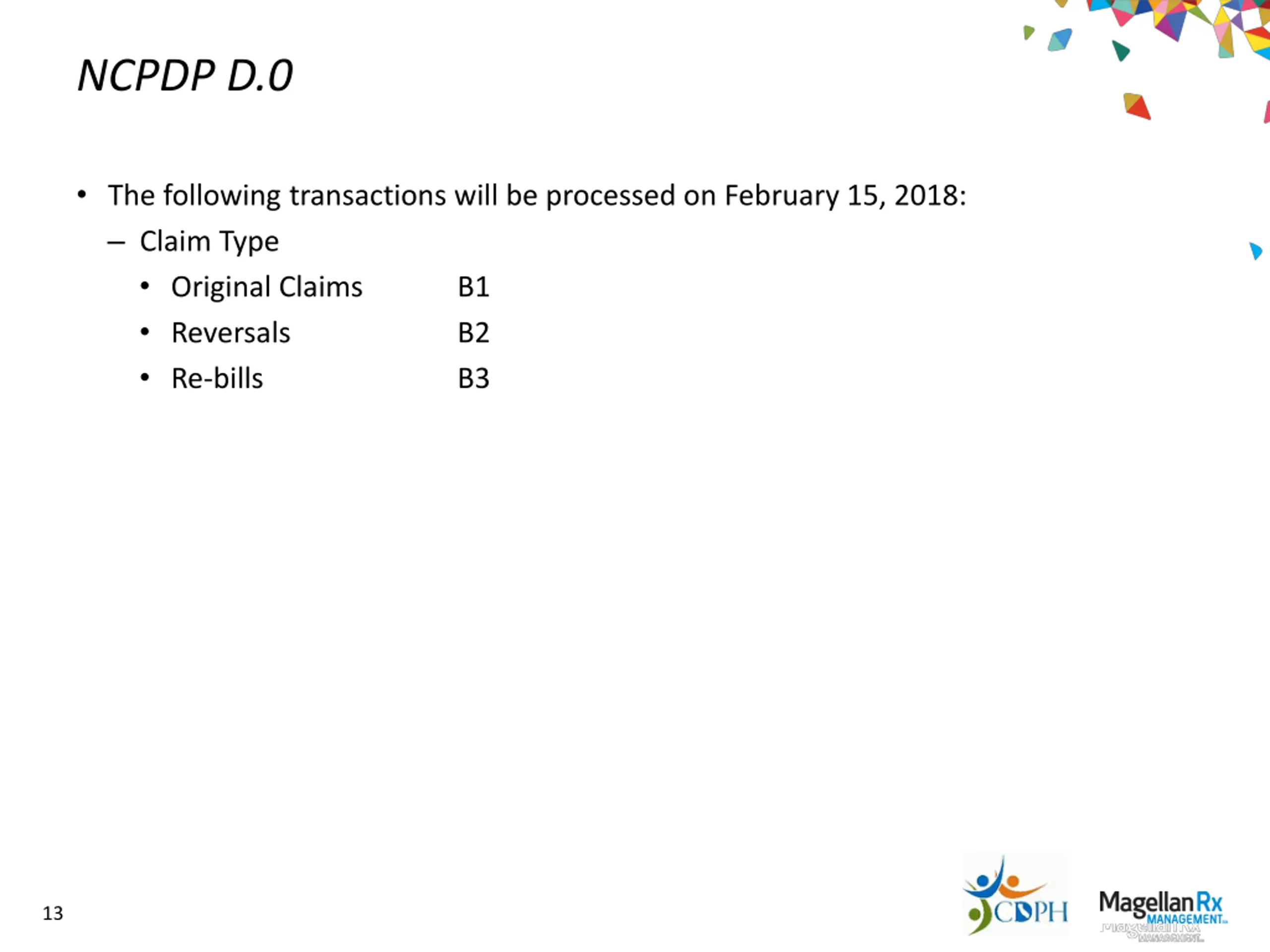 NCPDP D.0 The following transactions will be processed on February 15, 2018: Claim Type Original Claims B1 Reversals B2 Re-bills B3 13