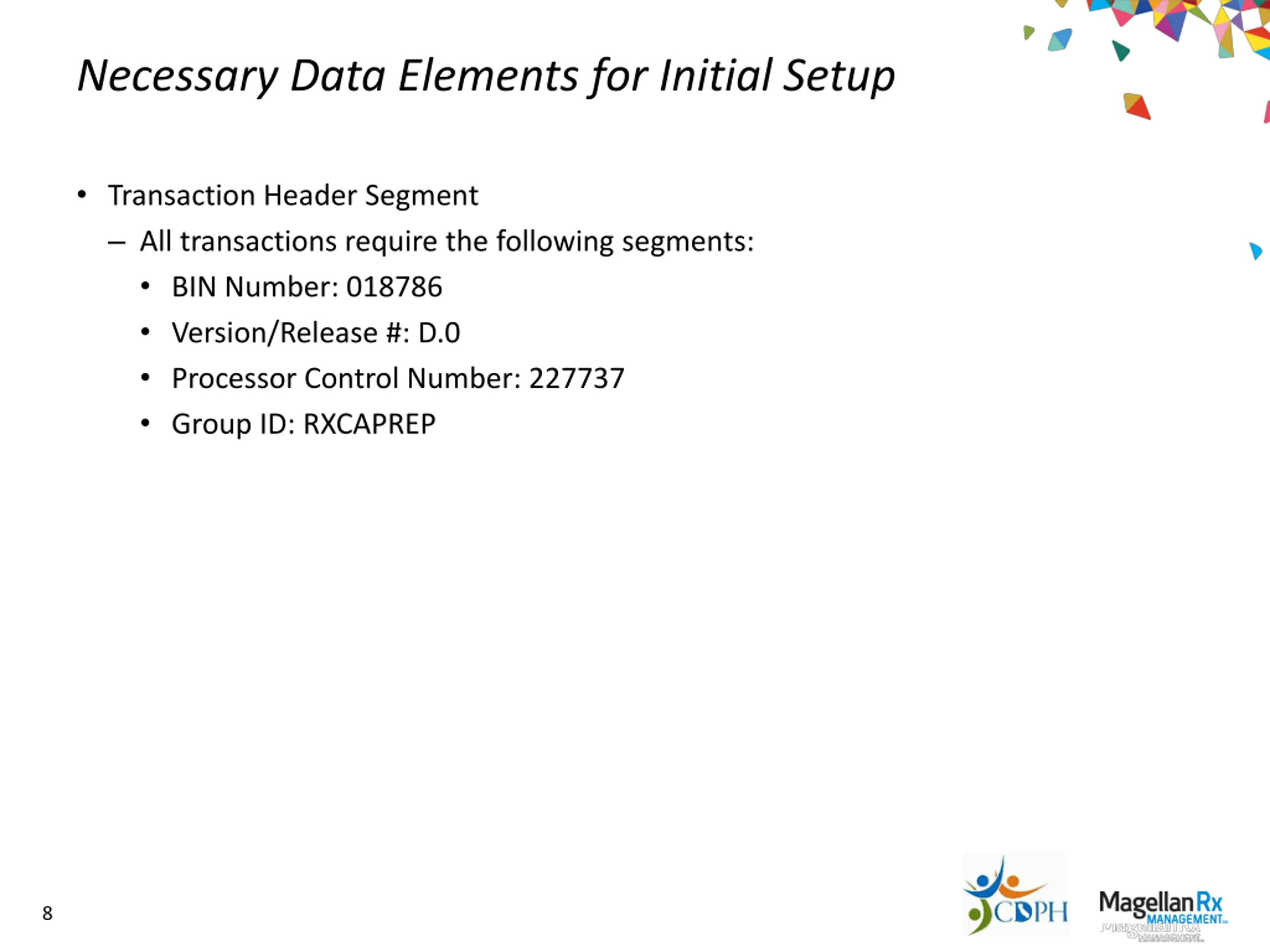 Necessary Data Elements for Initial Setup Transaction Header Segment All transactions require the following segments: BIN Number: 018786 Version/Release #: D.0 Processor Control Number: 227737 Group ID: RXCAPREP 8