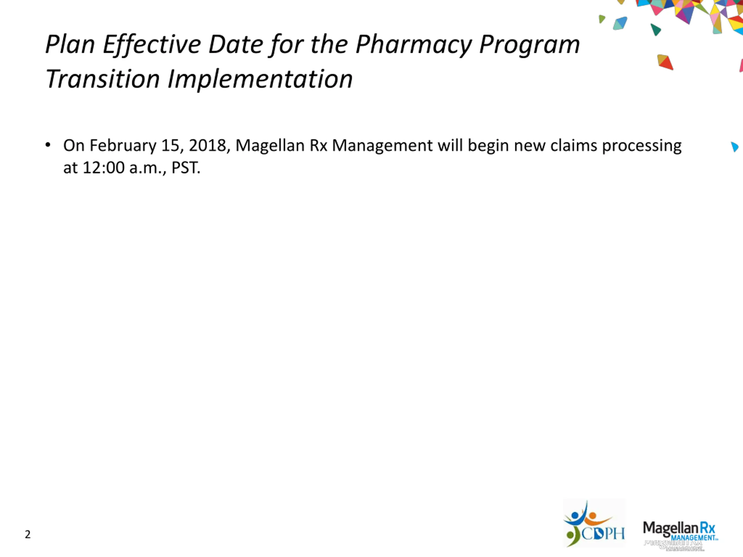 Plan Effective Date for the Pharmacy Program Transition Implementation On February 15, 2018, Magellan Rx Management will begin new claims processing at 12:00 a.m., PST. 2
