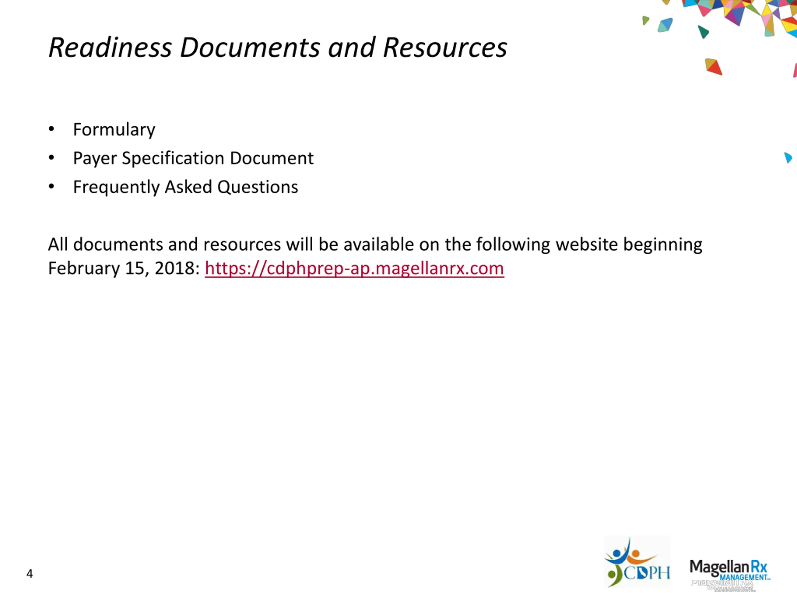 Readiness Documents and Resources All documents and resources will be available on the following website beginning February 15, 2018: https://cdphprep-ap.magellanrx.com Formulary Payer Specification Document Frequently Asked Questions 4
