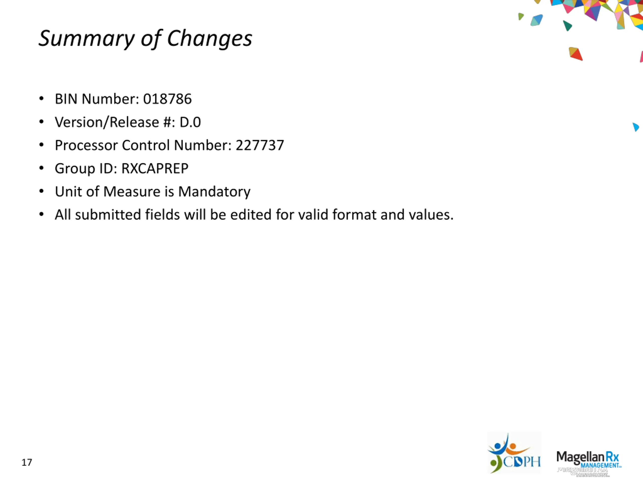 Summary of Changes BIN Number: 018786 Version/Release #: D.0 Processor Control Number: 227737 Group ID: RXCAPREP Unit of Measure is Mandatory All submitted fields will be edited for valid format and values. 17