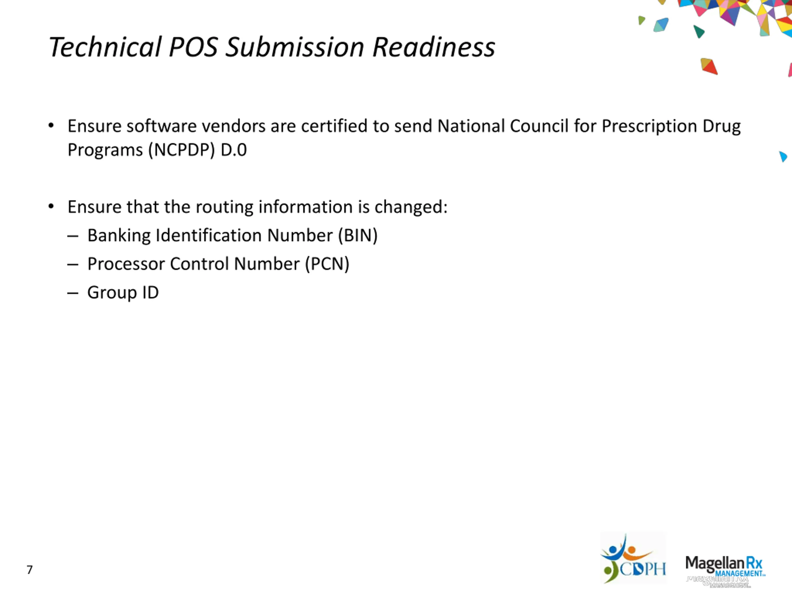 Technical POS Submission Readiness Ensure software vendors are certified to send National Council for Prescription Drug Programs (NCPDP) D.0 Ensure that the routing information is changed: Banking Identification Number (BIN) Processor Control Number (PCN) Group ID 7