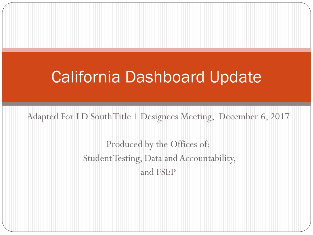 California Dashboard Update Adapted For LD South Title 1 Designees Meeting, December 6, 2017 Produced by the Offices of: Student Testing, Data and Accountability, and FSEP