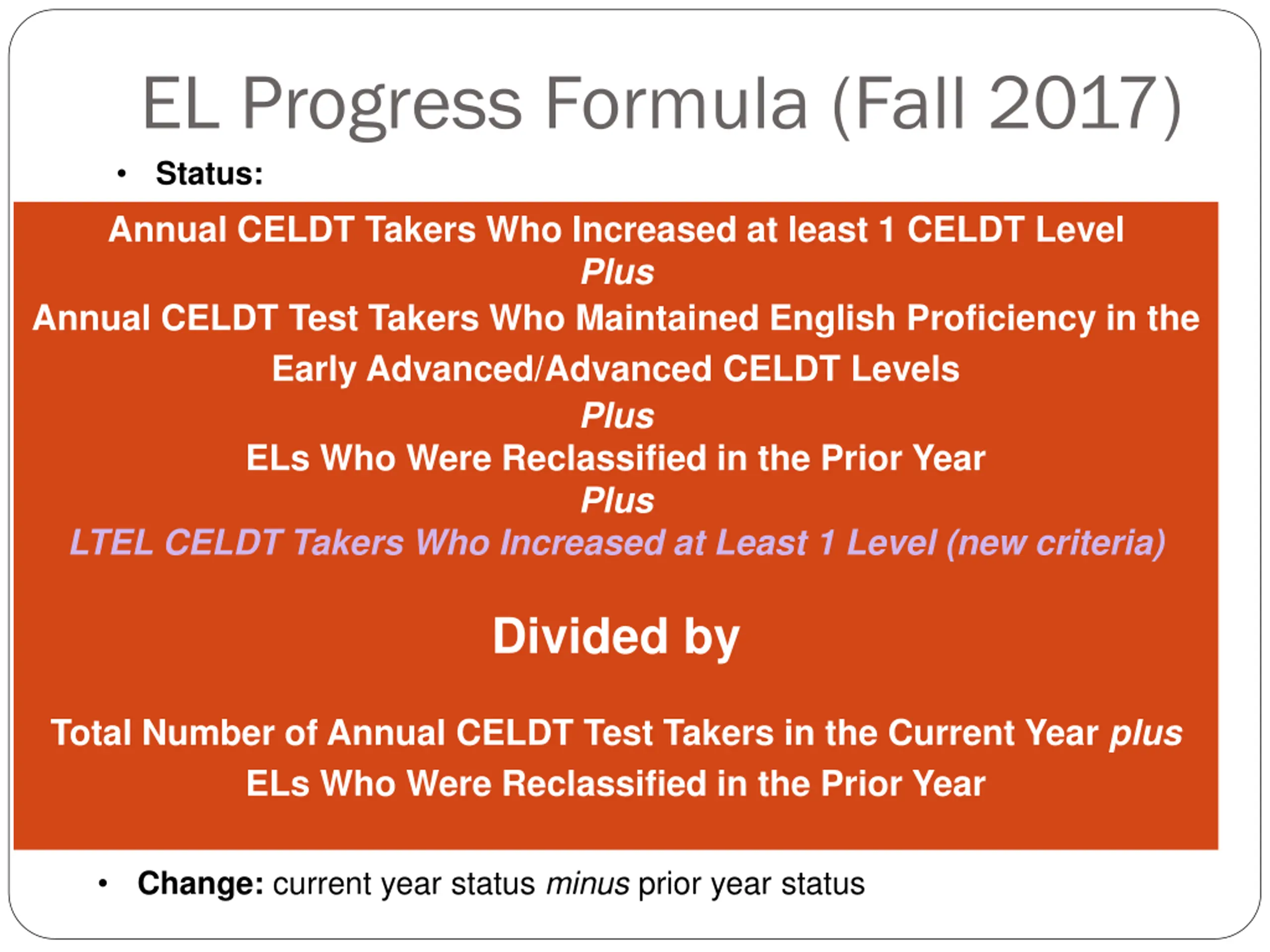 EL Progress Formula (Fall 2017) Status: Annual CELDT Takers Who Increased at least 1 CELDT Level Plus Annual CELDT Test Takers Who Maintained English Proficiency in the Early Advanced/Advanced CELDT Levels Plus ELs Who Were Reclassified in the Prior Year Plus LTEL CELDT Takers Who Increased at Least 1 Level (new criteria) Divided by Total Number of Annual CELDT Test Takers in the Current Year plus ELs Who Were Reclassified in the Prior Year Change: current year status minus prior year status