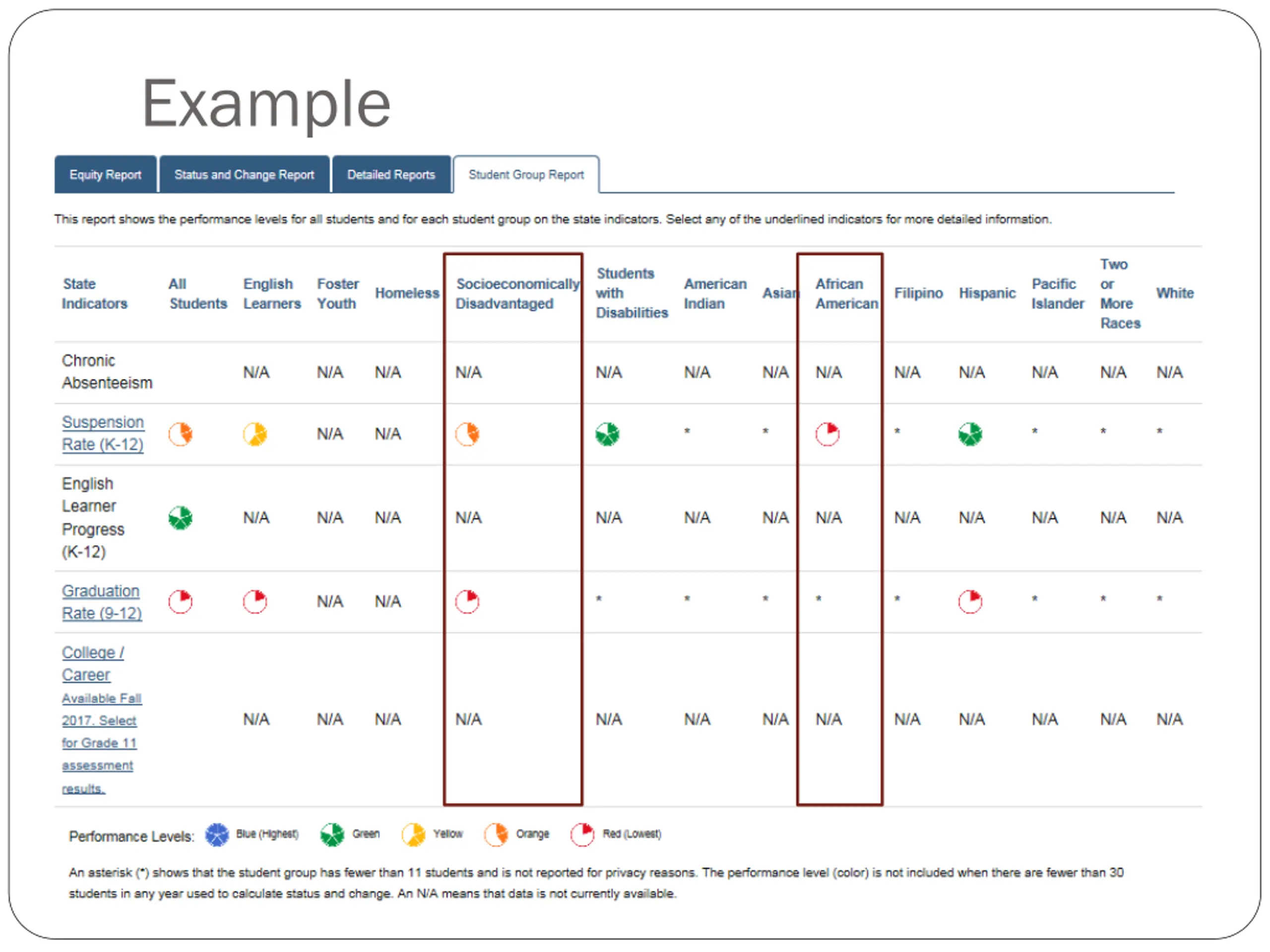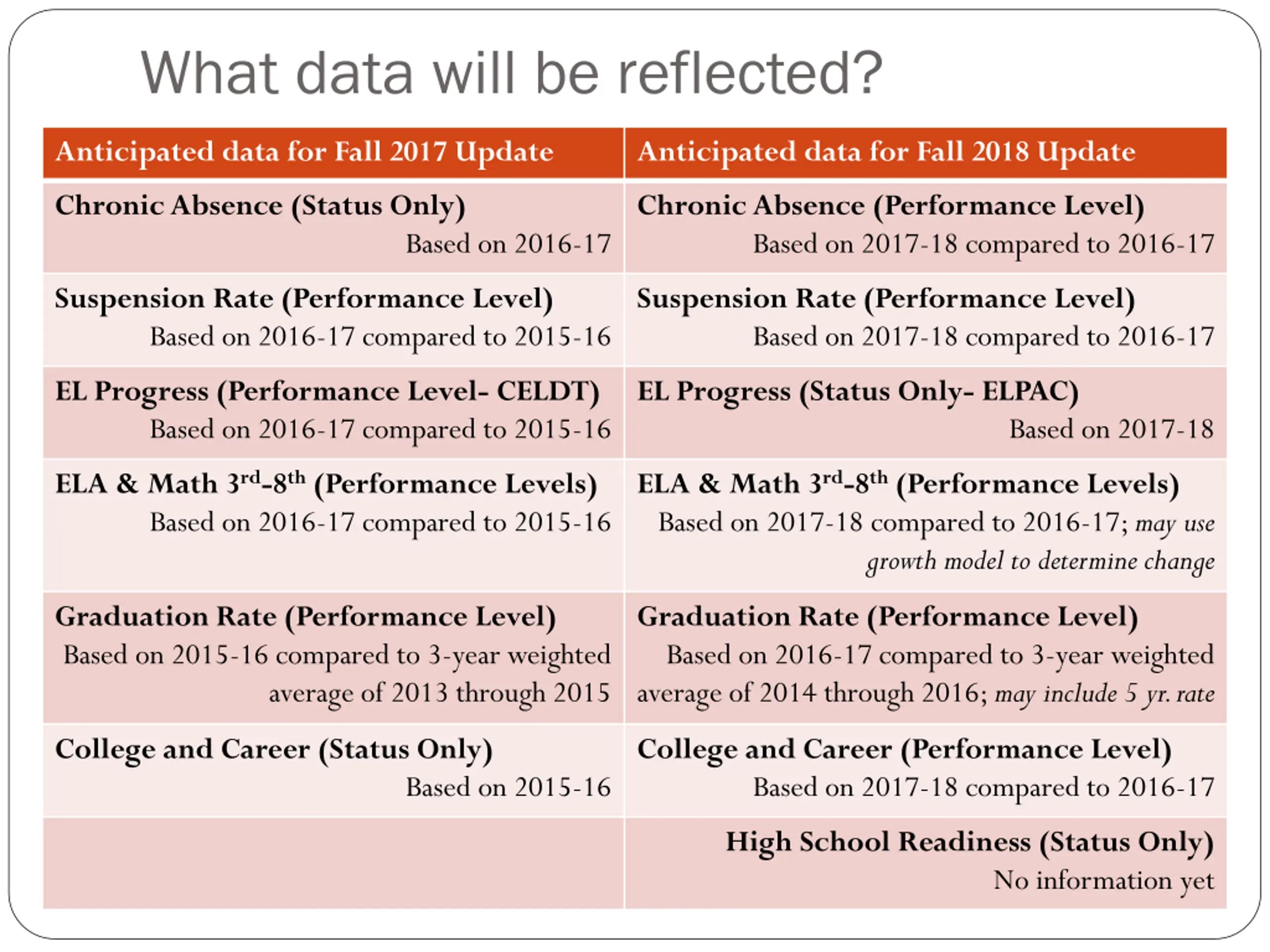 What data will be reflected? Anticipated data for Fall 2017 Update Anticipated data for Fall 2018 Update Chronic Absence (Status Only) Chronic Absence (Performance Level) Based on 2017-18 compared to 2016-17 Based on 2016-17 Suspension Rate (Performance Level) Based on 2016-17 compared to 2015-16 Suspension Rate (Performance Level) Based on 2017-18 compared to 2016-17 EL Progress (Performance Level- CELDT) Based on 2016-17 compared to 2015-16 EL Progress (Status Only- ELPAC) Based on 2017-18 ELA & Math 3rd-8th (Performance Levels) Based on 2016-17 compared to 2015-16 ELA & Math 3rd-8th (Performance Levels) Based on 2017-18 compared to 2016-17; may use growth model to determine change Graduation Rate (Performance Level) Based on 2015-16 compared to 3-year weighted average of 2013 through 2015 Graduation Rate (Performance Level) Based on 2016-17 compared to 3-year weighted average of 2014 through 2016; may include 5 yr. rate College and Career (Status Only) College and Career (Performance Level) Based on 2017-18 compared to 2016-17 Based on 2015-16 High School Readiness (Status Only) No information yet