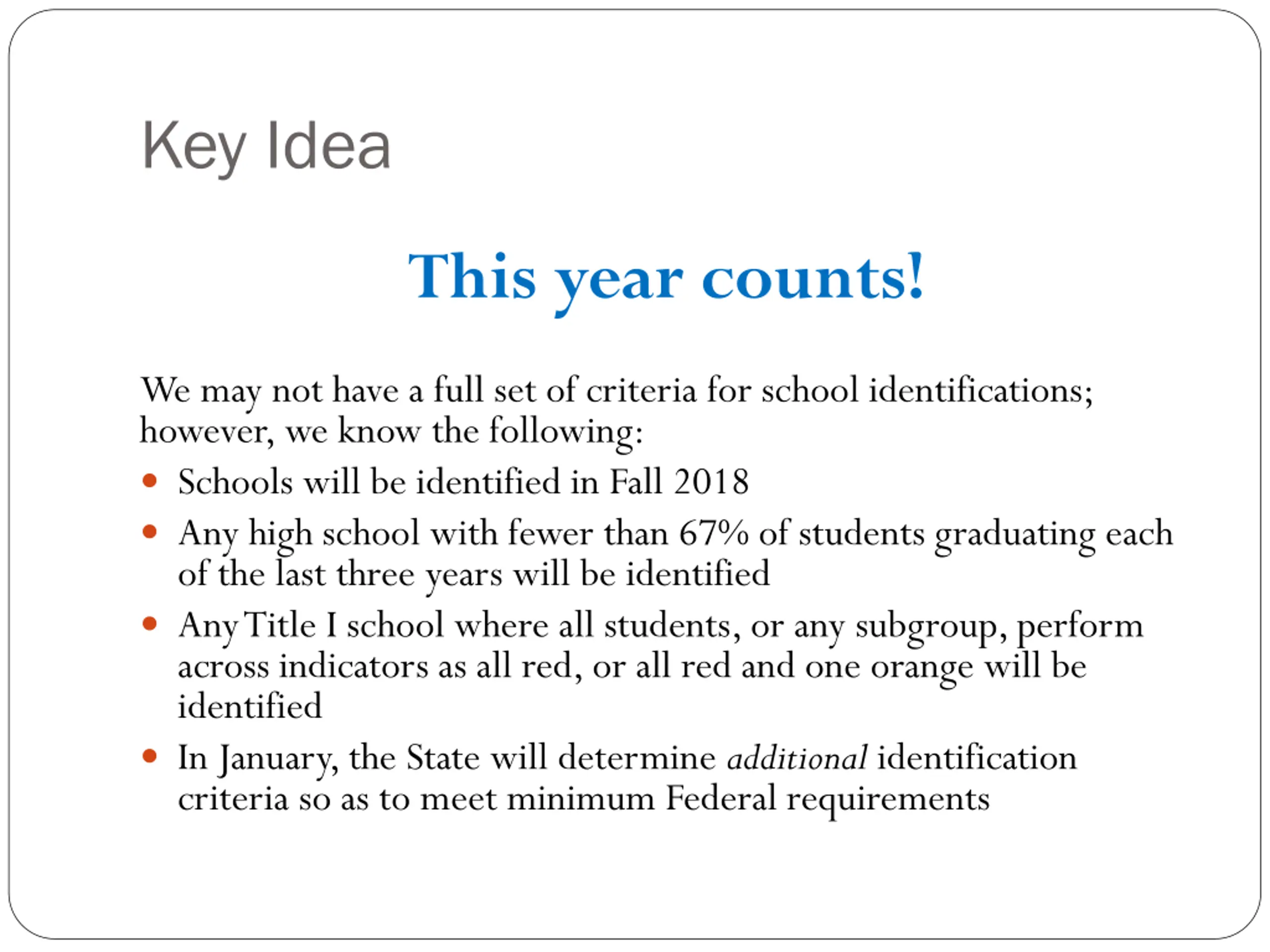 Key Idea This year counts! We may not have a full set of criteria for school identifications; however, we know the following: Schools will be identified in Fall 2018 Any high school with fewer than 67% of students graduating each of the last three years will be identified Any Title I school where all students, or any subgroup, perform across indicators as all red, or all red and one orange will be identified In January, the State will determine additional identification criteria so as to meet minimum Federal requirements