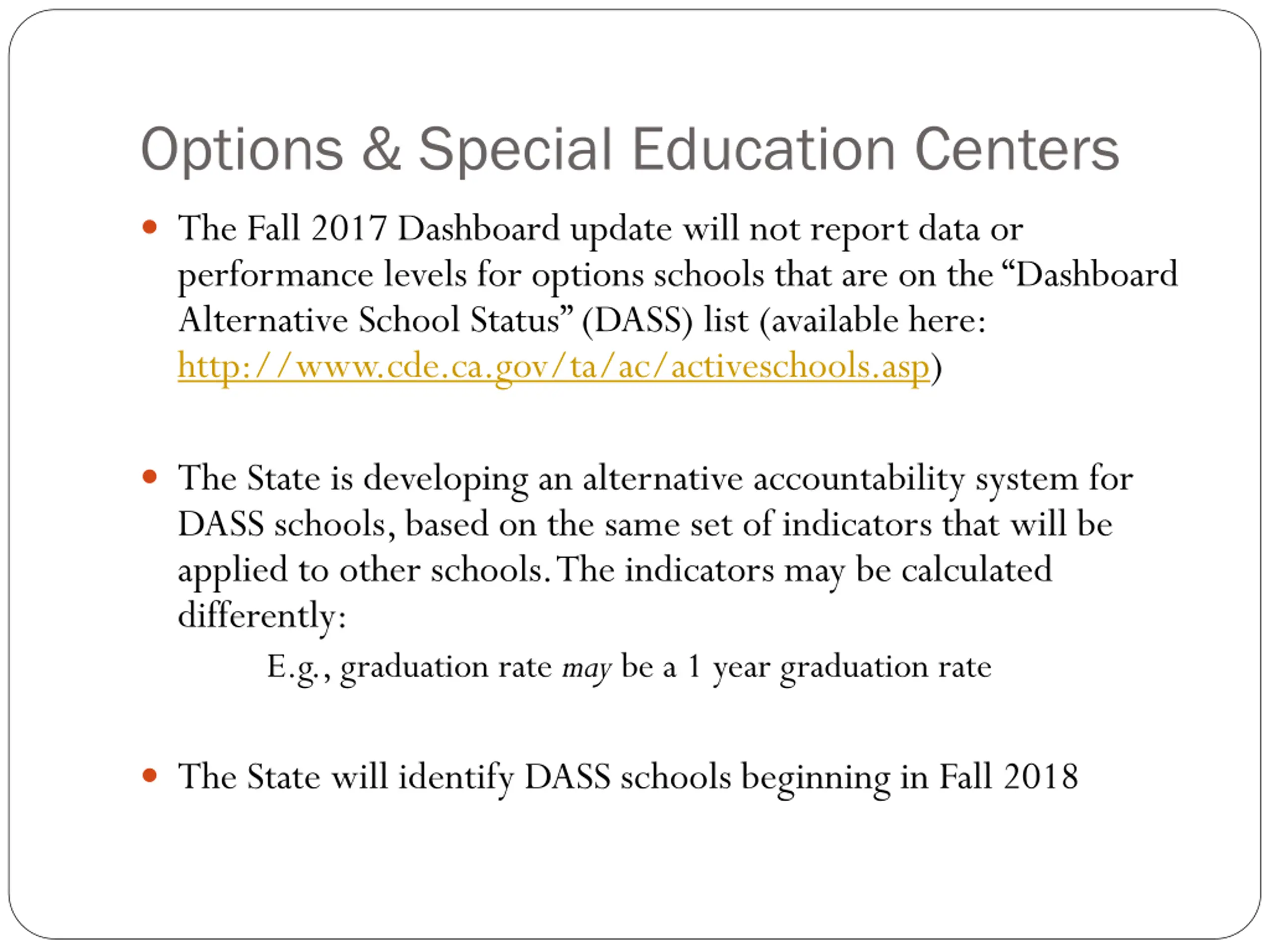 Options & Special Education Centers The Fall 2017 Dashboard update will not report data or performance levels for options schools that are on the Dashboard Alternative School Status (DASS) list (available here: http://www.cde.ca.gov/ta/ac/activeschools.asp) The State is developing an alternative accountability system for DASS schools, based on the same set of indicators that will be applied to other schools. The indicators may be calculated differently: E.g., graduation rate may be a 1 year graduation rate The State will identify DASS schools beginning in Fall 2018