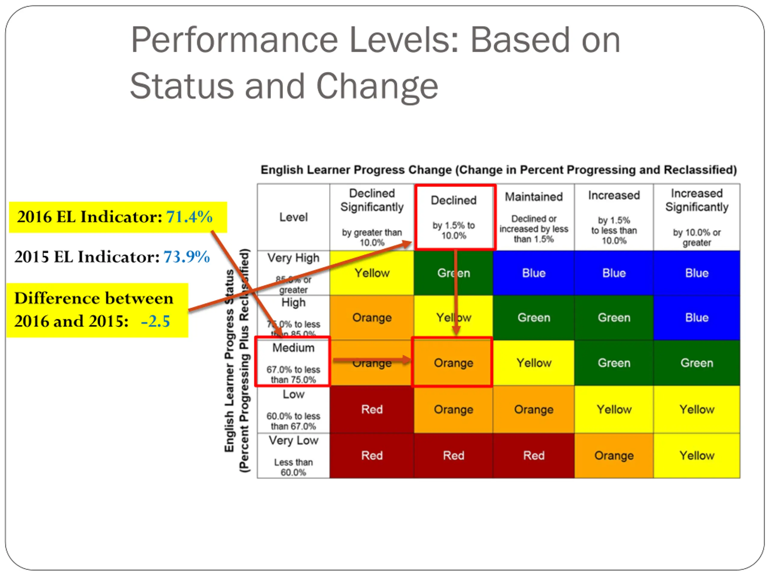 Performance Levels: Based on Status and Change 2016 EL Indicator: 71.4% 2015 EL Indicator: 73.9% Difference between 2016 and 2015: -2.5