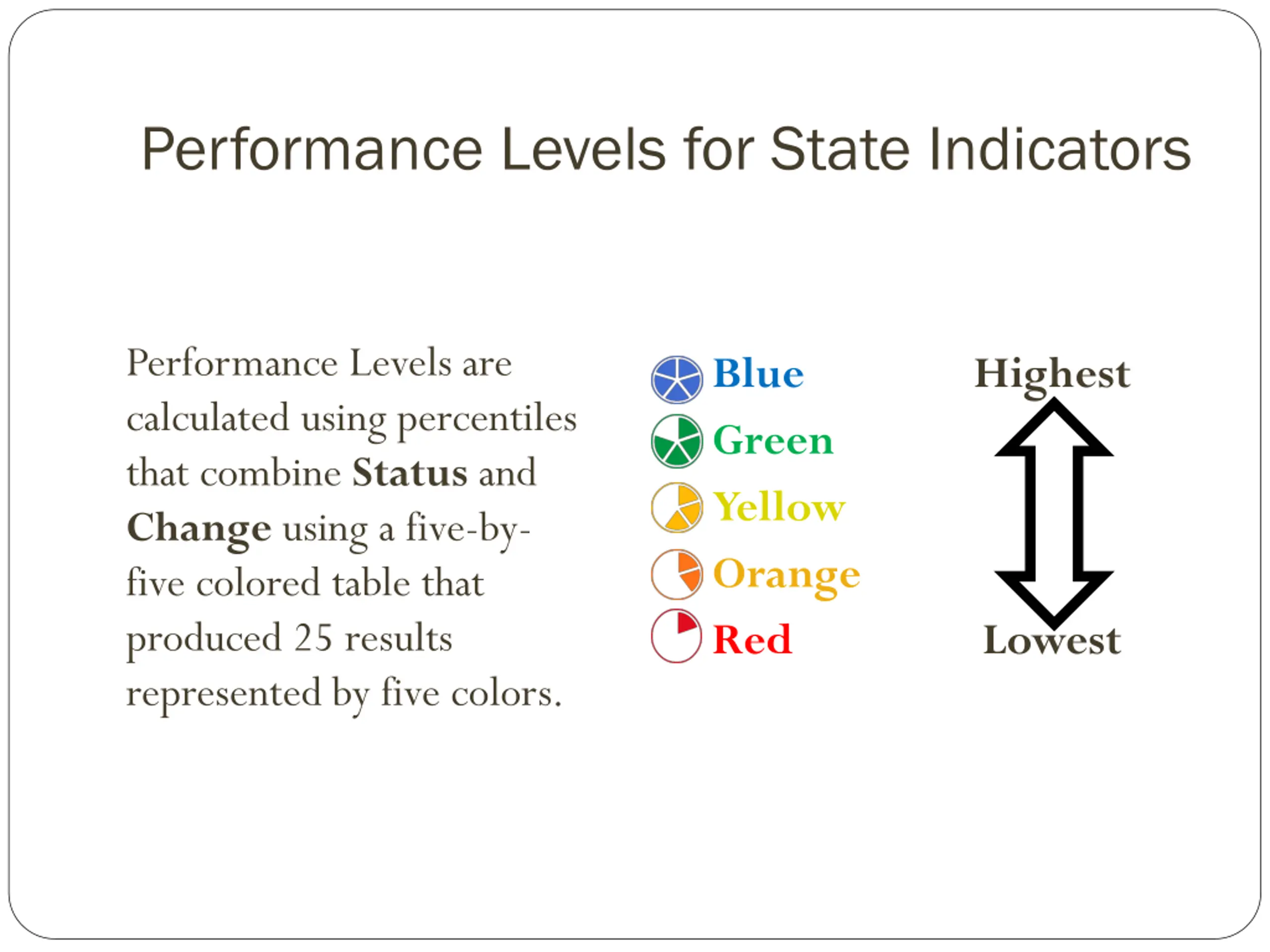 Performance Levels for State Indicators Performance Levels are calculated using percentiles that combine Status and Change using a five-by- five colored table that produced 25 results represented by five colors. Blue Green Yellow Orange Red Highest Lowest