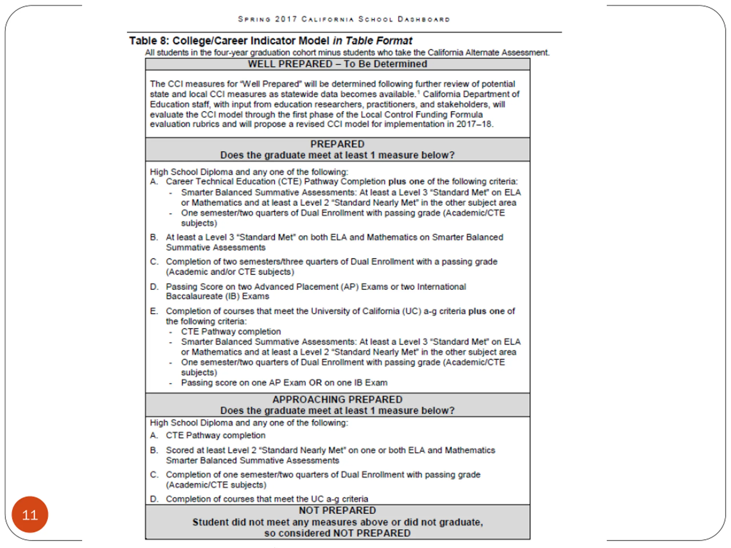 College & Career Formula Status: note that students who take the California Alternate Assessment (CAA) are not included in the CCI and are removed from the calculations. Class of 2016 Graduates Who Meet the Prepared Benchmark divided by Class of 2016 Graduation Cohort minus Students Who Take the CAAs Change will not be reported in Fall 2017 Update 9