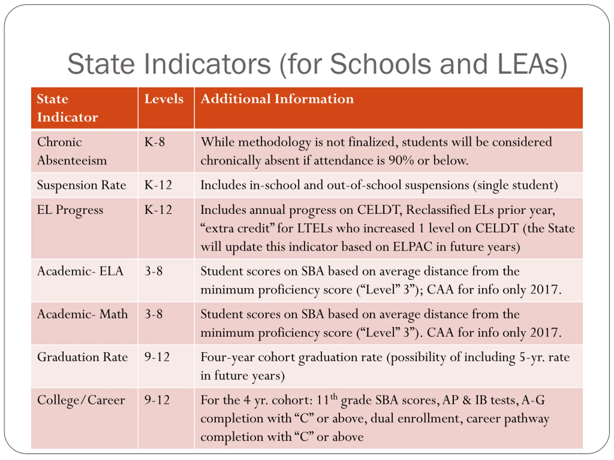 State Indicators (for Schools and LEAs) State Indicator Chronic Absenteeism Suspension Rate EL Progress Levels Additional Information K-8 While methodology is not finalized, students will be considered chronically absent if attendance is 90% or below. Includes in-school and out-of-school suspensions (single student) Includes annual progress on CELDT, Reclassified ELs prior year, extra credit for LTELs who increased 1 level on CELDT (the State will update this indicator based on ELPAC in future years) Student scores on SBA based on average distance from the minimum proficiency score ( Level 3 ); CAA for info only 2017. Student scores on SBA based on average distance from the minimum proficiency score ( Level 3 ). CAA for info only 2017. Four-year cohort graduation rate (possibility of including 5-yr. rate in future years) For the 4 yr. cohort: 11th grade SBA scores, AP & IB tests, A-G completion with C or above, dual enrollment, career pathway completion with C or above K-12 K-12 Academic- ELA 3-8 Academic- Math 3-8 Graduation Rate 9-12 College/Career 9-12