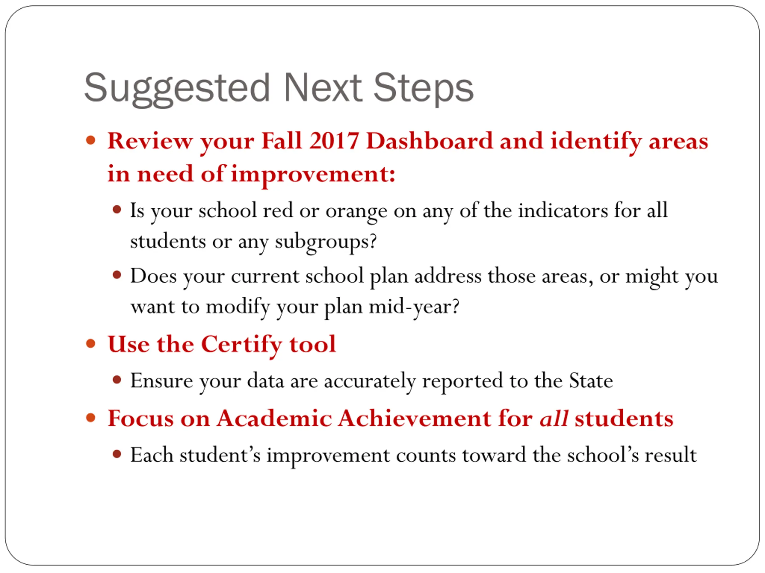 Suggested Next Steps Review your Fall 2017 Dashboard and identify areas in need of improvement: Is your school red or orange on any of the indicators for all students or any subgroups? Does your current school plan address those areas, or might you want to modify your plan mid-year? Use the Certify tool Ensure your data are accurately reported to the State Focus on Academic Achievement for all students Each student s improvement counts toward the school s result