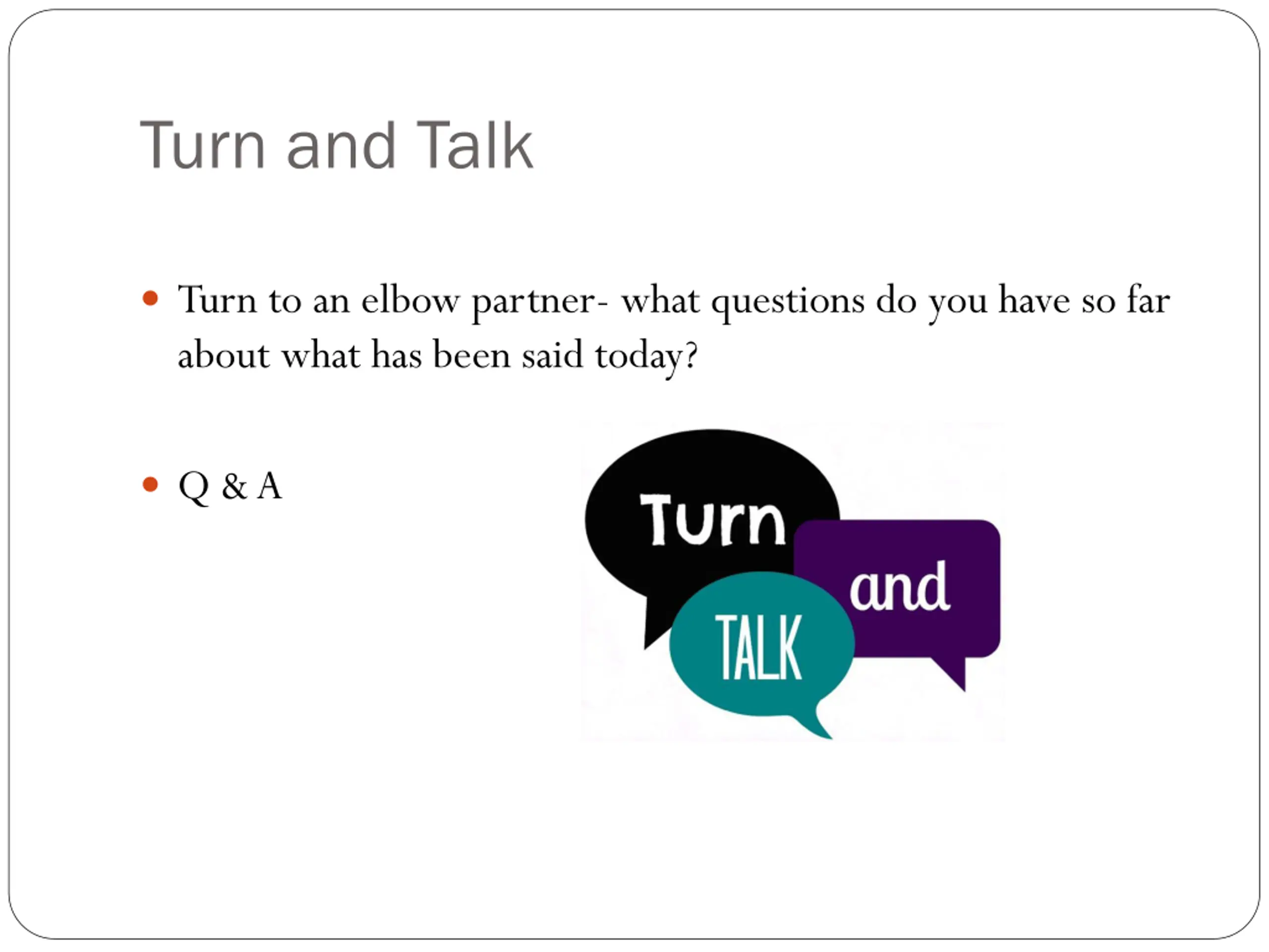 Turn and Talk Turn to an elbow partner- what questions do you have so far about what has been said today? Q & A