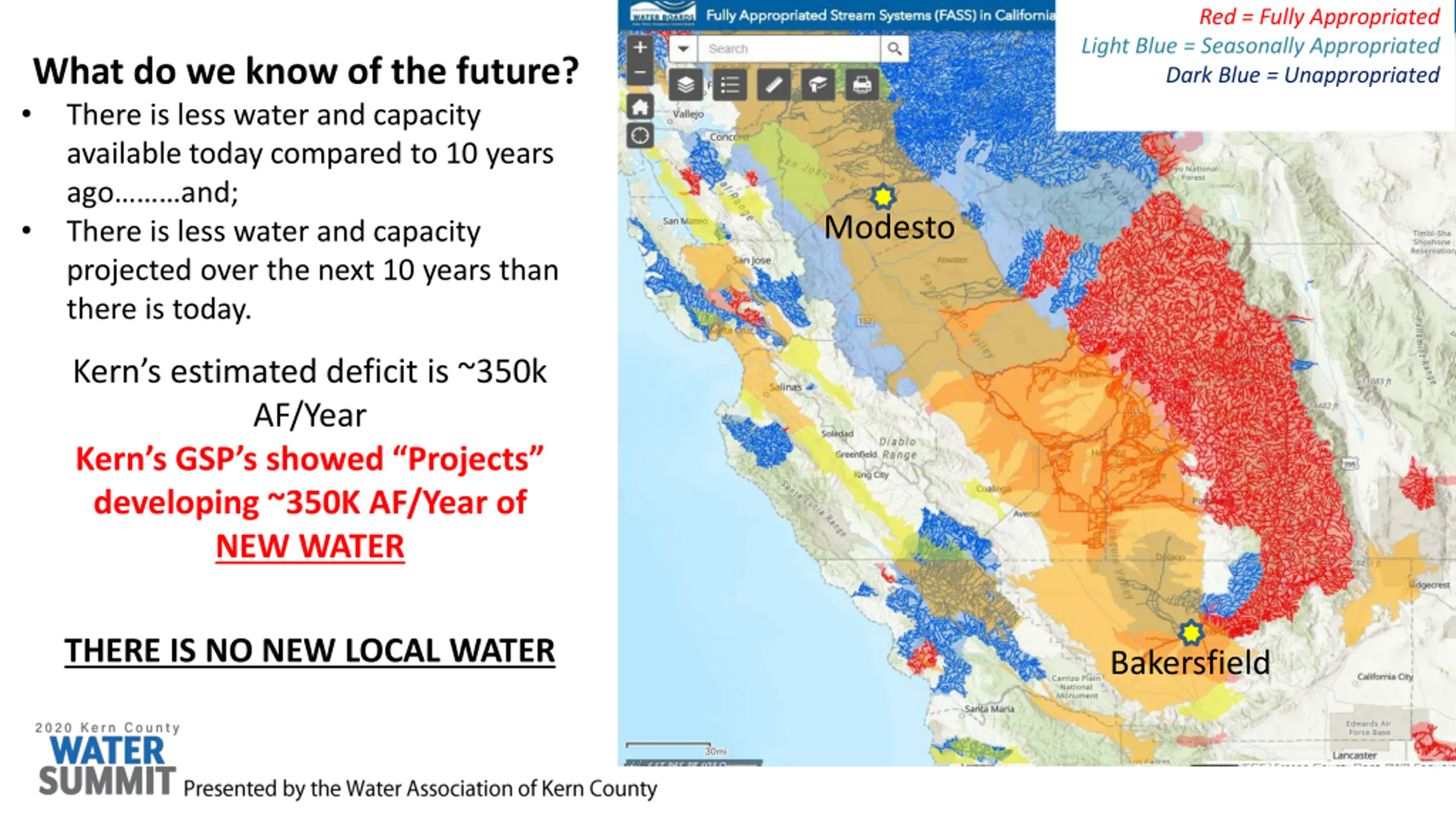 Red = Fully Appropriated Light Blue = Seasonally Appropriated Dark Blue = Unappropriated What do we know of the future? There is less water and capacity available today compared to 10 years ago and; There is less water and capacity projected over the next 10 years than there is today. Modesto Kern s estimated deficit is ~350k AF/Year Kern s GSP s showed Projects developing ~350K AF/Year of NEW WATER THERE IS NO NEW LOCAL WATER Bakersfield