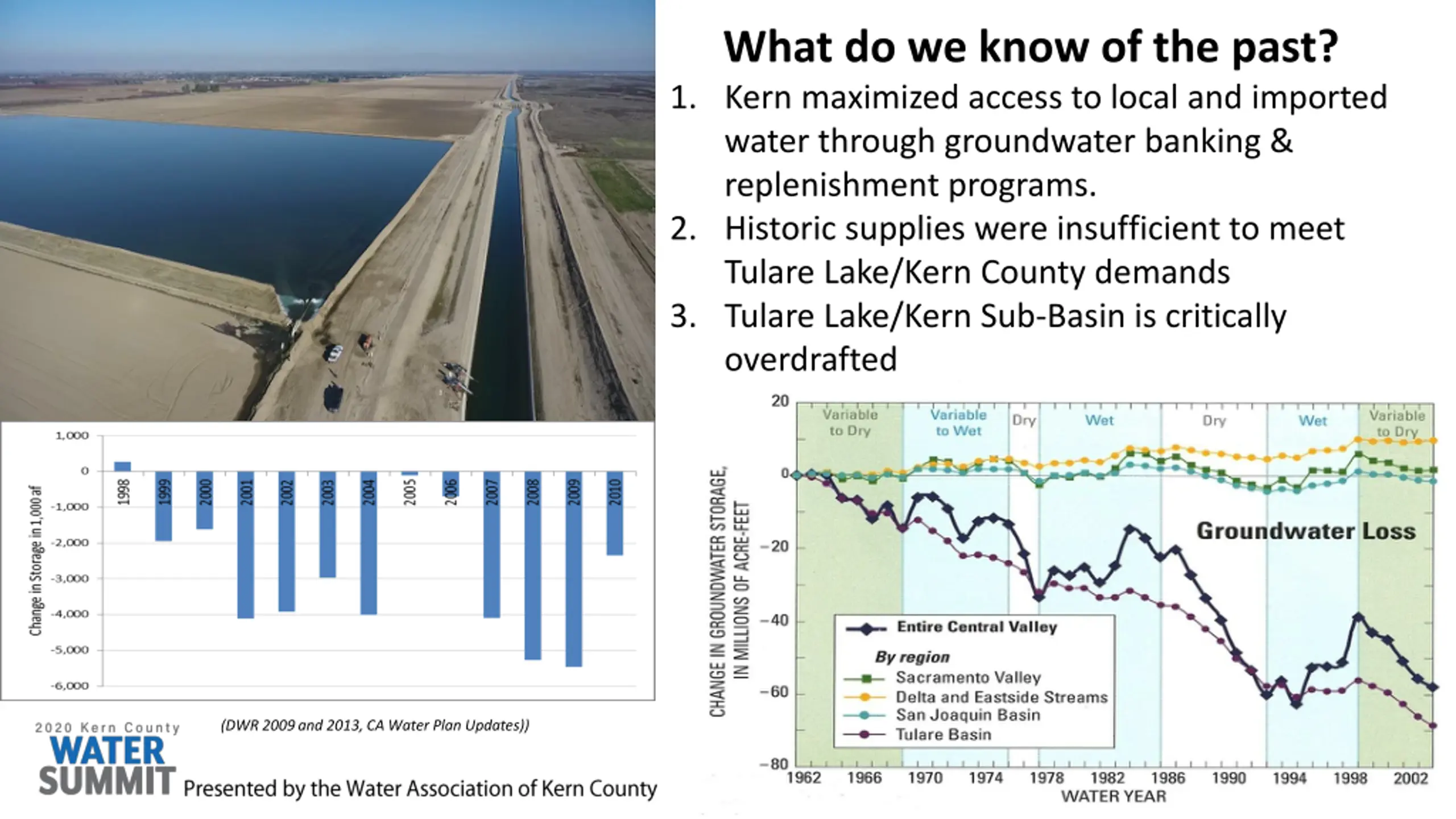 What do we know of the past? 1. Kern maximized access to local and imported water through groundwater banking & replenishment programs. 2. Historic supplies were insufficient to meet Tulare Lake/Kern County demands 3. Tulare Lake/Kern Sub-Basin is critically overdrafted (DWR 2009 and 2013, CA Water Plan Updates))