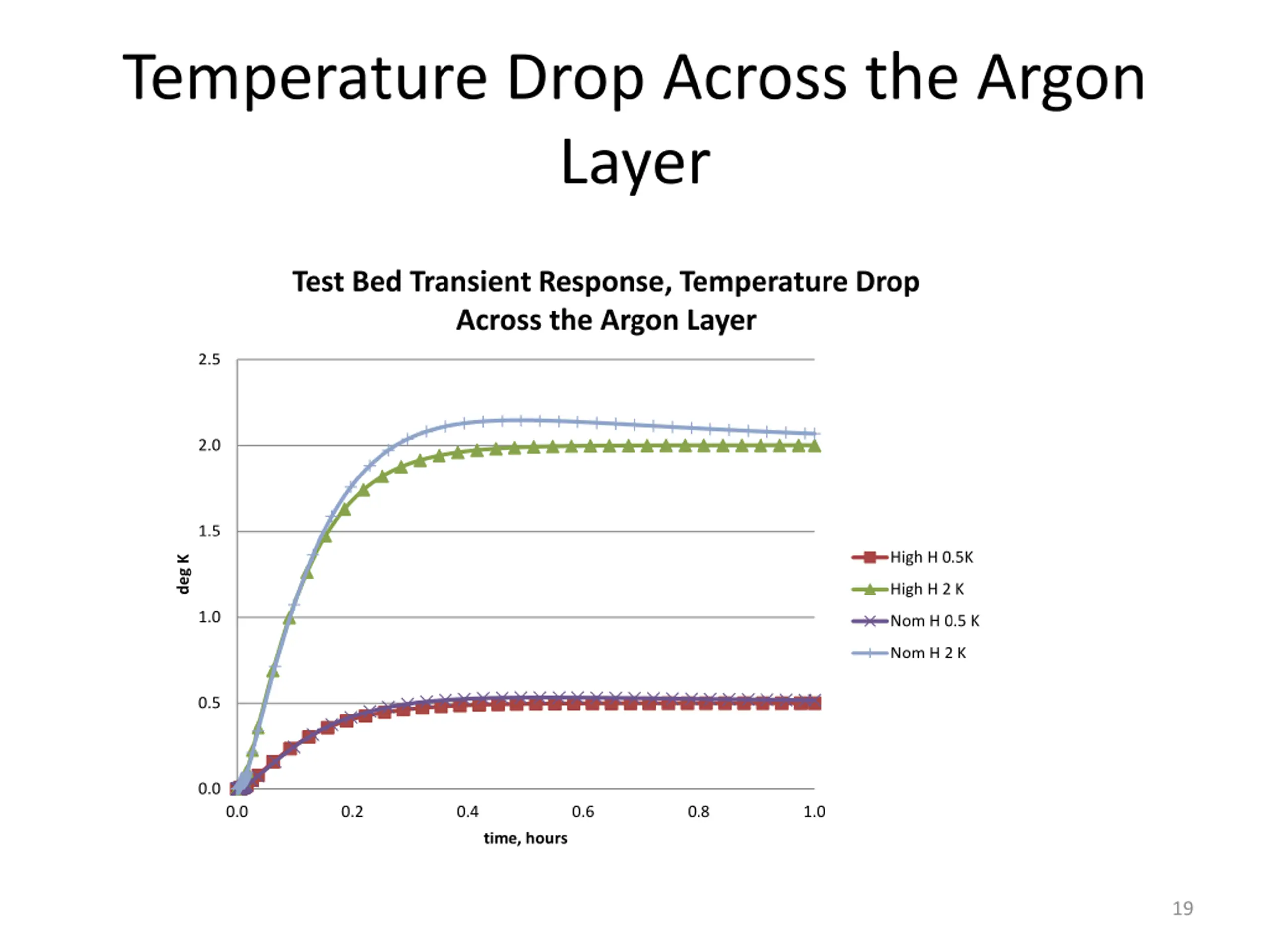 Temperature Drop Across the Argon Layer Test Bed Transient Response, Temperature Drop Across the Argon Layer 2.5 2.0 1.5 High H 0.5K deg K High H 2 K 1.0 Nom H 0.5 K Nom H 2 K 0.5 0.0 0.0 0.2 0.4 0.6 0.8 1.0 time, hours 19