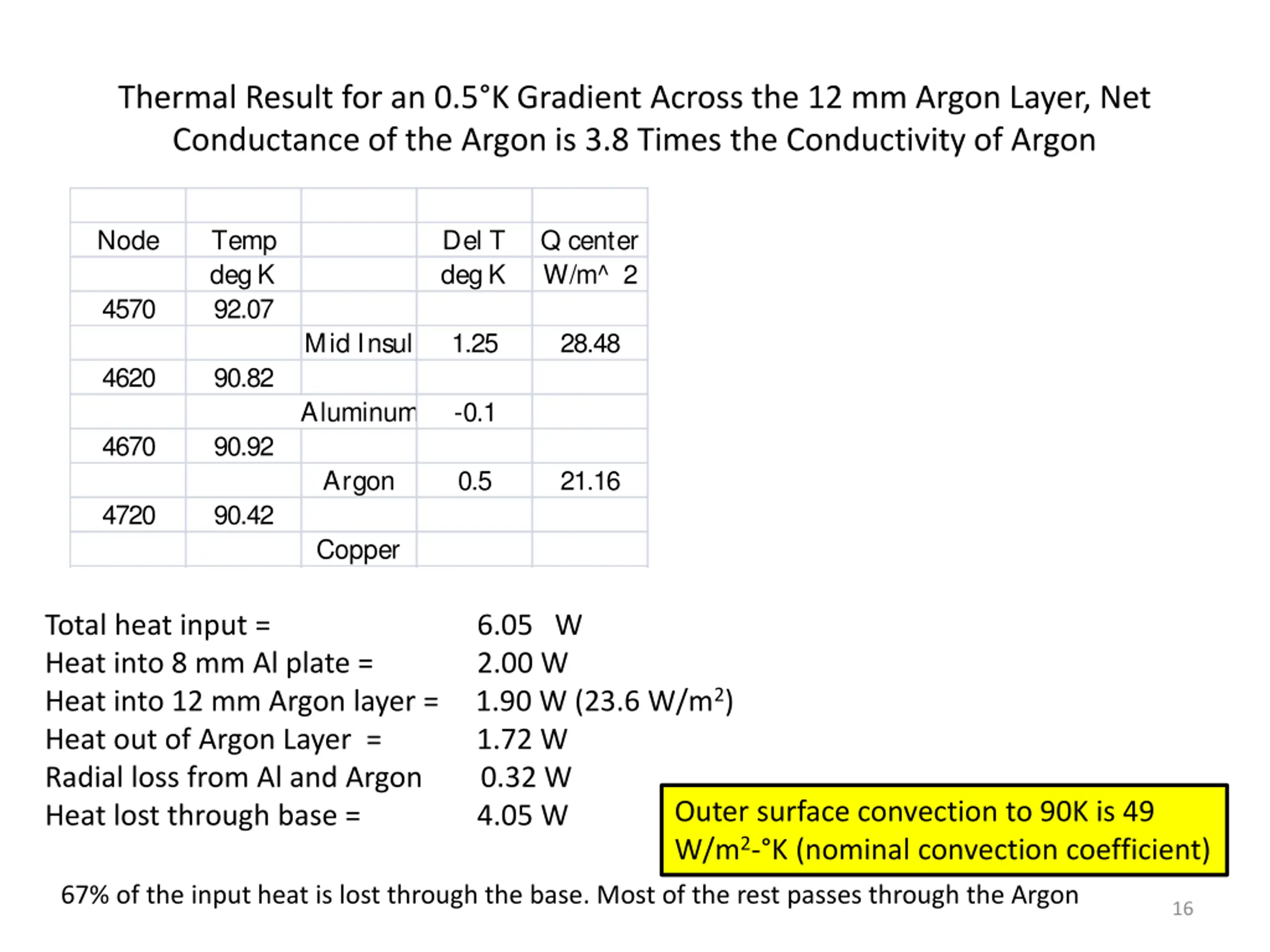 Thermal Result for a 2K Gradient Across the 12 mm Argon Layer, Net Conductance of the Argon is 4.8 Times the Conductivity of Argon Node Temp deg K 97.083 Del T deg K Q center W/m^ 2 4570 Mid Insul 5.045 125.36 4620 92.038 Aluminum 0.009 105.2 4670 92.029 Argon 2.002 105.28 4720 90.027 Copper Total heat input = Heat into 8 mm Al plate = Heat into 12 mm Argon layer = 8.62 W (107 W/m2) Heat out of Argon Layer = 8.26 W Radial loss from Al and Argon 0.49 W Heat lost through base = 31.18 W 8.78 W Outer surfaces fixed at 90 K (very high convection coefficient) 22.04 W 70% of the input heat is lost through the base. Most of the rest passes through the Argon 15