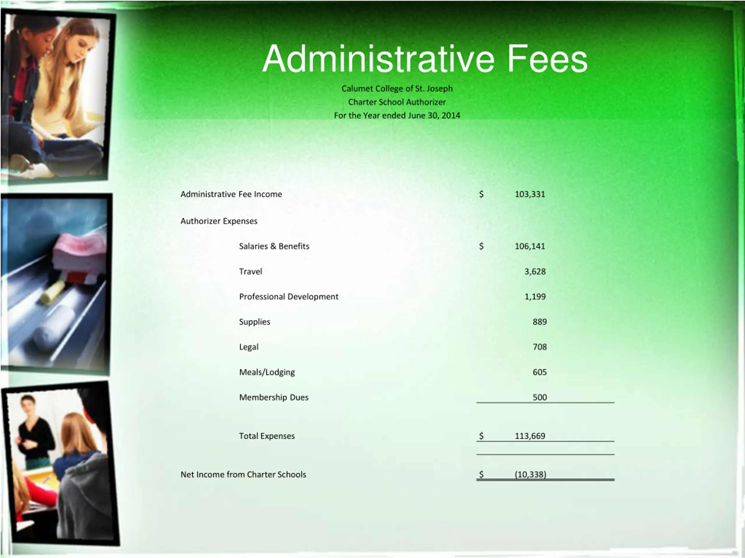 Administrative Fees Calumet College of St. Joseph Charter School Authorizer For the Year ended June 30, 2014 Administrative Fee Income $ 103,331 Authorizer Expenses Salaries & Benefits $ 106,141 Travel 3,628 Professional Development 1,199 Supplies 889 Legal 708 Meals/Lodging 605 Membership Dues 500 Total Expenses $ 113,669 Net Income from Charter Schools $ (10,338)