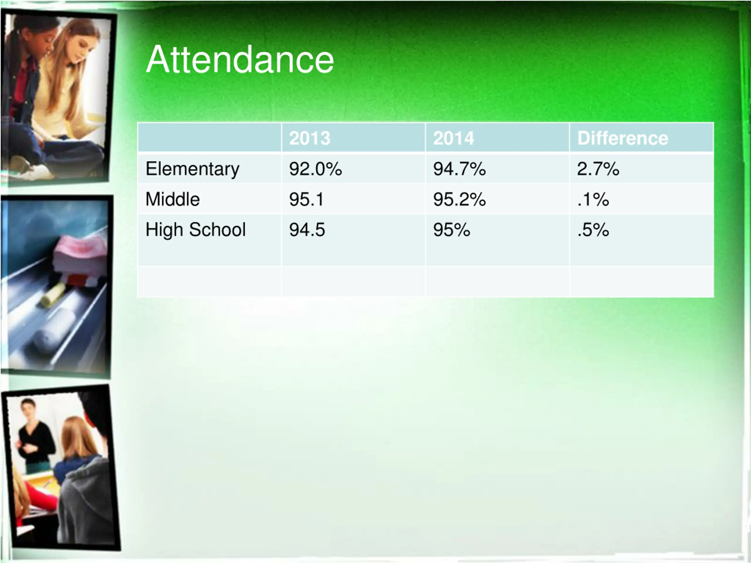 Attendance 2013 92.0% 95.1 94.5 2014 94.7% 95.2% 95% Difference 2.7% .1% .5% Elementary Middle High School
